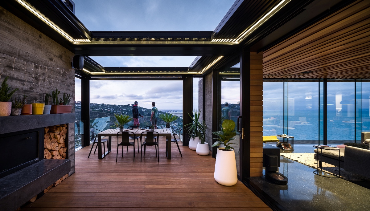 Materialele au fost alese atât pentru a-şi pune reciproc în valoare proprietăţile estetice, cât şi pentru a servi unor funcţii bine gândite. Astfel, betonul aparent garantează rezistenţa construcţiei şi ajută şi la absorbţia căldurii. Lemnul de cedru aduce o notă de căldură şi contribuie, de asemenea, la confortul acustic. Nu în ultimul rând, ferestrele glisante fără ramă asigură o privelişte neîntreruptă asupra împrejurimilor spectaculoase.