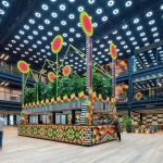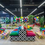 Artistul și designerul britanic Morag Myerscough (care a semnat, printre altele și instalații la mai multe ediții ale festivalului Summer Well) a creat o cafenea-pavilion, o adevărată explozie coloristică și plină de plante care s-a instalat în spațiul public al unei clădiri de birouri londoneze – 1 Finsbury Avenue Square (Broadgate) –, inaugurată în toamna lui 2019. Designerul a pornit de la ideea legăturii intime pe care o avem cu natura, care în ultimele luni s-a transpus prin umplerea caselor noastre cu plante și flori. „Fascinația mea legată de parcurile publice din perioada victoriană (în copilărie locuiam foarte aproape de Finsbury Park) care îi invitau pe muncitorii orașului să respire aer curat în weekenduri, m-a inspirat să aduc parcul într-un spațiu de lucru, la 1FA”, a povestit Morag. Și cafeneaua devine, într-adevăr, un real parc, întins pe întreg atriumul care include și o serie de pereți pictați manual. Zona de mese, bănci și jardiniere intră în jocul biofil și coloristic-eclectic, în executarea acestora Morag Myerscough colaborând cu Luke Morgan. Interesantă este și istoria materialelor utilizate, cum ar fi gresia ceramică, pentru decorarea căreia designerul britanic a ales să combine elemente inspirate de epoca victoriană cu simboluri și linii proprii. Toate acestea fac un contrast bun cu personalitatea simetrică a clădirii de birouri, cu pardoseala deschis-neutră și cu structura metalică vopsită în negru.