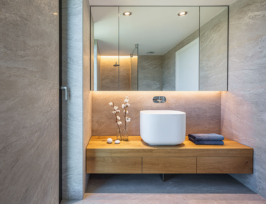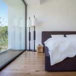 Aflată în etaj, zona de noapte, alcătuită din trei dormitoare cu două băi, se deschide spre o terasă peste birou. În tonuri naturale şi texturi autentice, pardoseli din lemn, mobilier din lemn, placaje de piatră sau ceramice lasă simplitatea unor pereţi albi, luminoşi să fie un fel de contenitoare locuite, inundate de frumuseţea pădurii Vlăsiei.