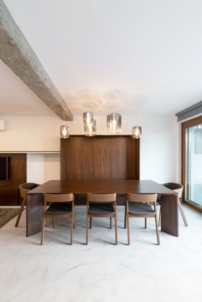 Datorită strategiei flexibile de mobilare, bucătăria şi livingul par să „curgă” una în cealaltă, făcând aproape imperceptibilă graniţa dintre ele, iar fiecare poate fi extinsă în funcţie de nevoile beneficiarilor. De asemenea, zona de zi este unificată şi ritmată de prezenţa grinzilor din beton aparent, aluzie la specificul arhitectural al zonei, lemnul tradiţional fiind înlocuit de un material care plasează amenajarea ferm în contemporaneitate.