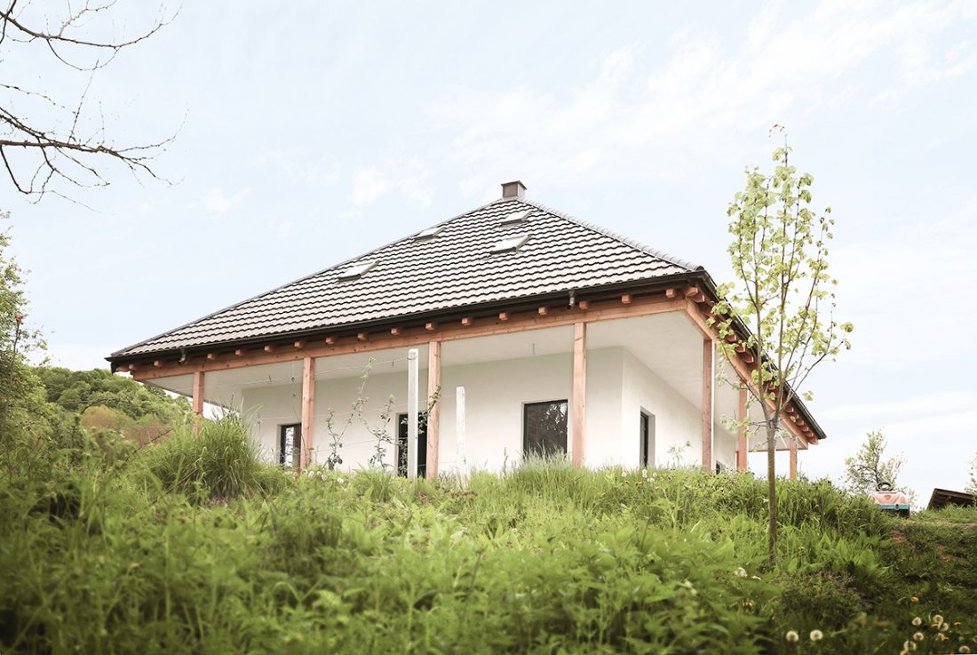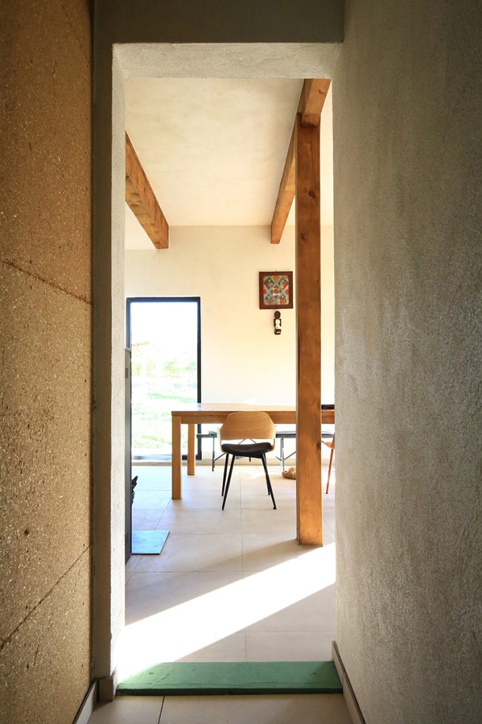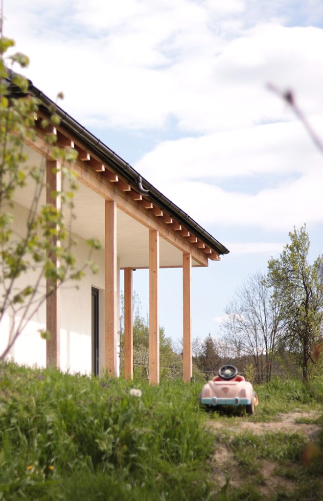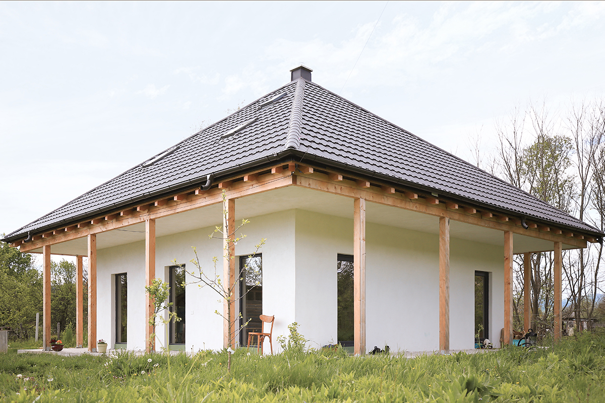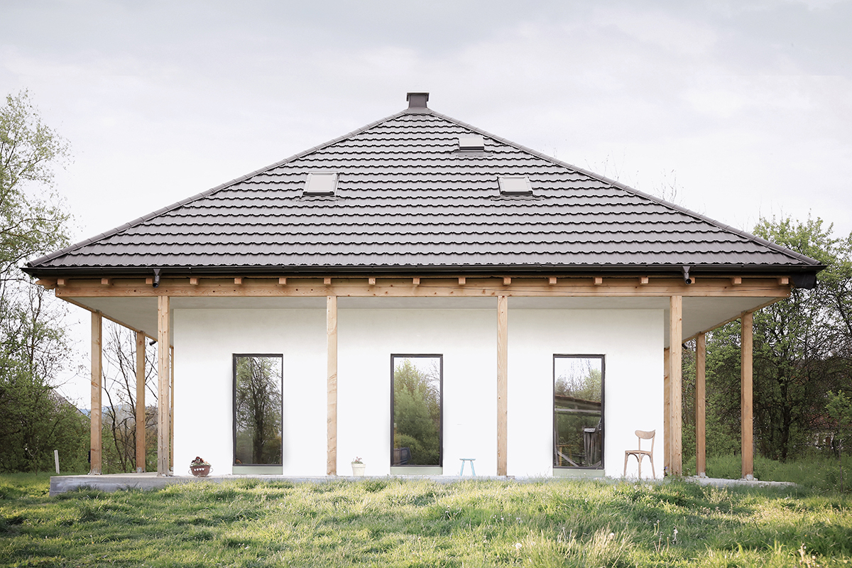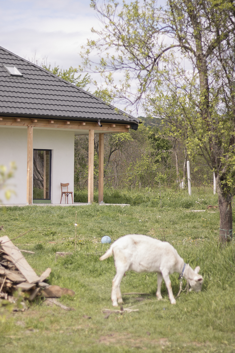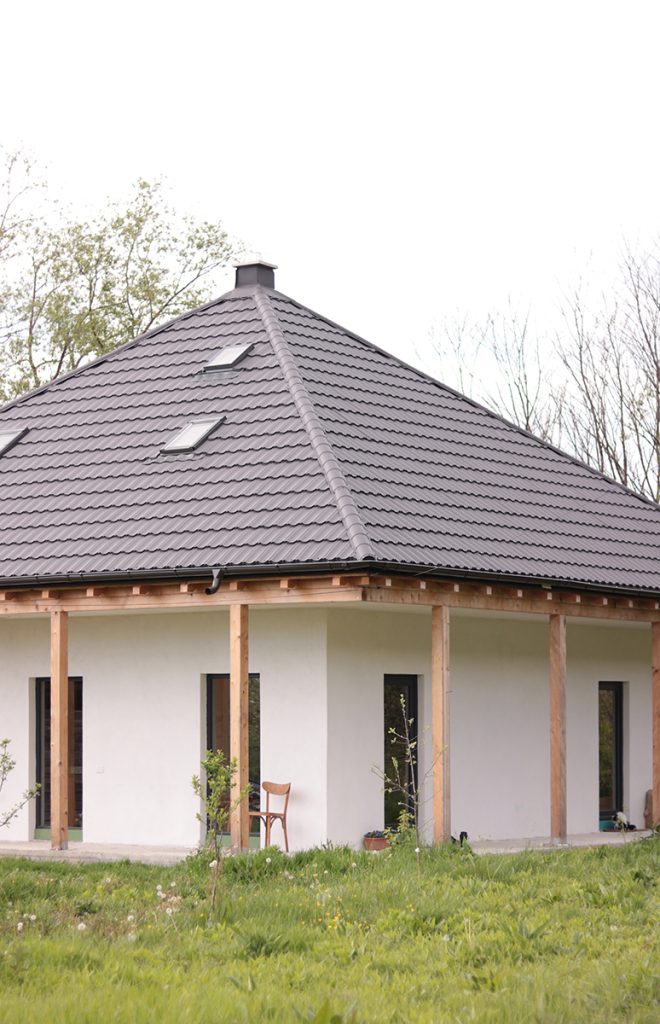 Centrul material și simbolic al casei este marcat de coșul de fum corespunzând sobei ce încălzește tot interiorul, amplasată în spațiul comun de la parter. În jurul acestui ax se dezvoltă întreaga structură din lemn, aparentă sau îmbrăcată în diferite texturi de materiale. Astfel, la exterior, casa este închisă cu panouri din microfibre de paie, tencuite în alb, exprimând volumul parterului. Prin contrast, acoperișul este acoperit cu tablă gri închis, punctată de câteva luminatoare.