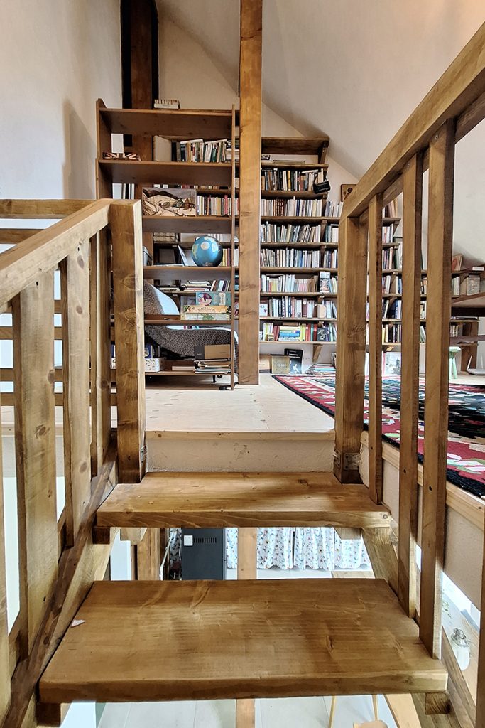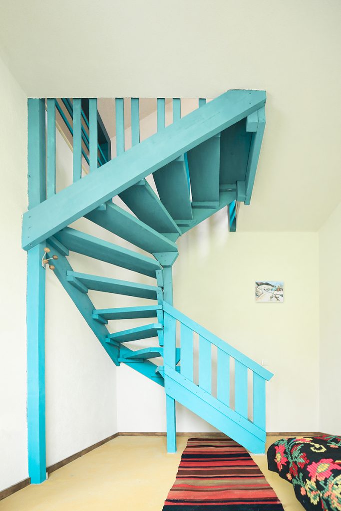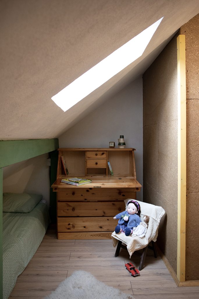 În interior, pereții sunt placați cu gipscarton vopsit alb sau cu panouri din microfibre de paie rămase aparente, fiecare mic „duplex” fiind diferit prin cromatica aleasă pentru vopseaua scărilor și a balustradelor, precum și prin culoarea elementelor ceramice din băi. Mobilierul este minimal, din piese și obiecte recuperate, adaptate sau chiar inventate, creând un sentiment de echilibru între confortul contemporan și o atmosferă artizanală, caldă și naturală.
