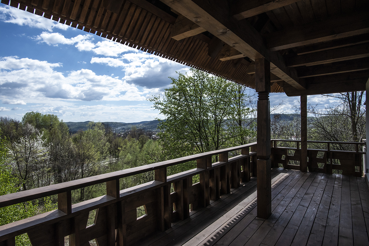 Modelul de stâlpi periferici este oltenesc, iar modelul de stâlp central este tot oltenesc, cu particularitatea că, din ce știu, este singurul model de stâlp antropomorf de la noi și care poate chiar aduce undeva cu vestita cultură dogon. Sita este realizată din brad (mai rezistent decât molidul) în 4+ straturi, montată cu cui ascuns zincat, grosime 7-8 mm, grosime primul rând și floare coamă 10-11 mm (floarea de coamă zisă și „ciocalandru” este tot de reprezentare oltenească), lungime 33 cm, expunere 8 cm și are acel bot de rată într-o viziune nouă. De altfel, acest model de șindrilă este singurul endemic românesc din multitudinea de abordări de la noi. Finalitatea structurală a șarpantei este realizată prin îndesirea laților de 45 mm cu interspații de 45 mm teșiți la capăt și, deci, eliminând detaliul de pazie care ar fi fost singurul element morfologic de lemn ce trebuia schimbat sau servisat mai des datorită expunerii la intemperii, și care nu avea, oricum, răspuns la geometria racordului pe curb. Astfel, la final singurul detaliu de lemn ce trebuie schimbat la o perioada rămâne sita. Perioada pe care o putem prelungi până la 50-70 de ani dacă se acordă atenție servisării cu un baiț corespunzător la momentele la care lemnul o cere. În structura de închidere a șarpantei, peste astereală avem o membrană specială care, conform fișei tehnice, ar avea protecție UV nelimitată.