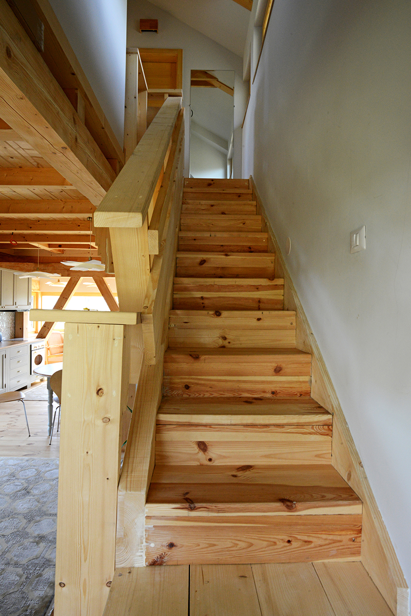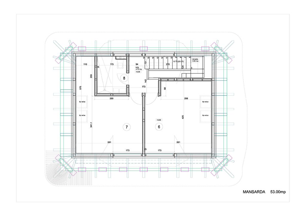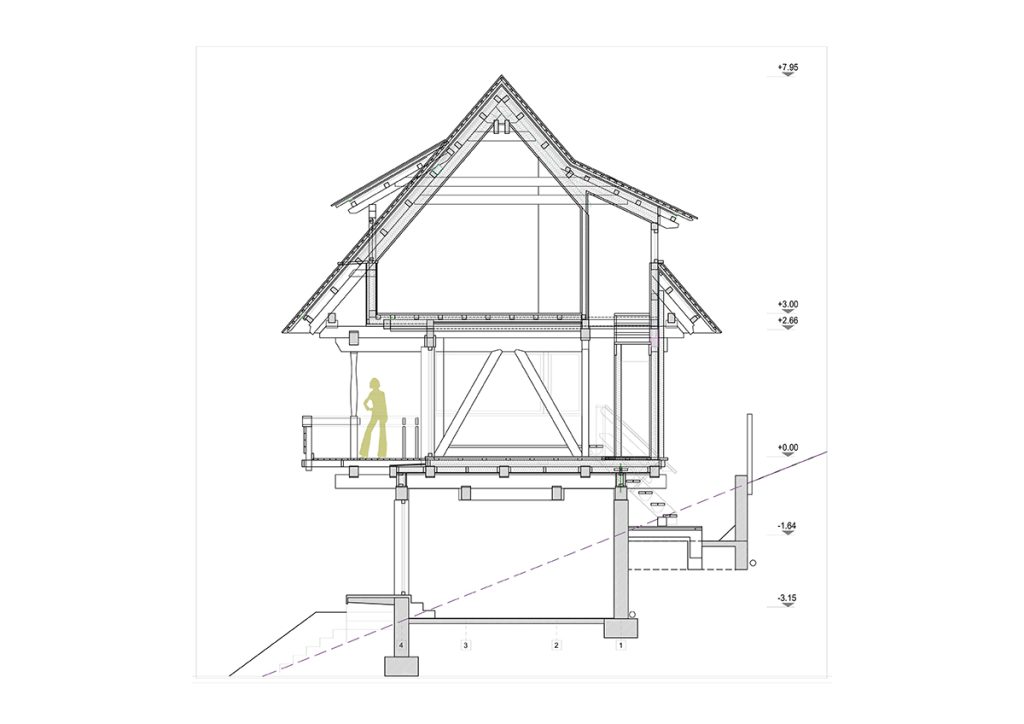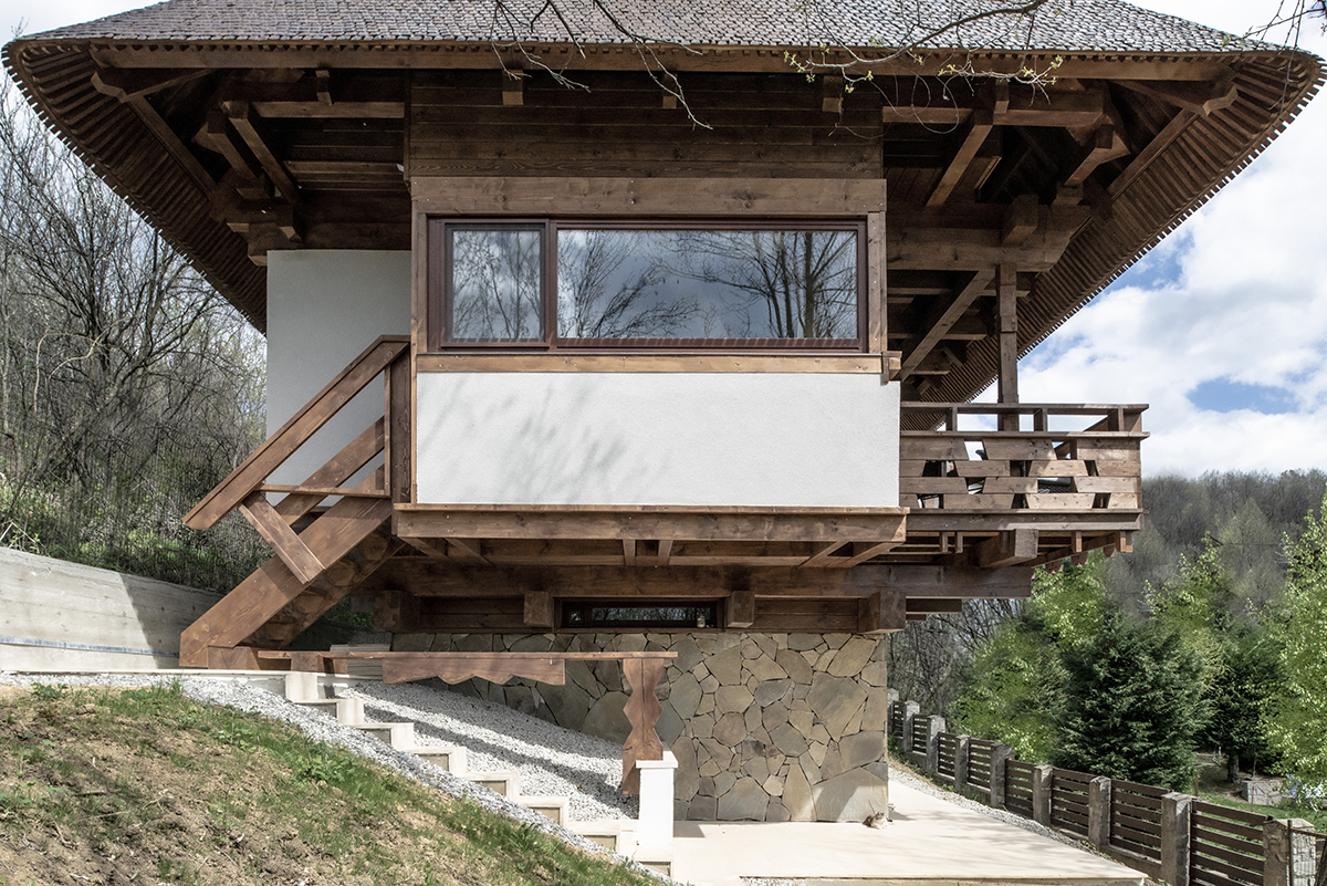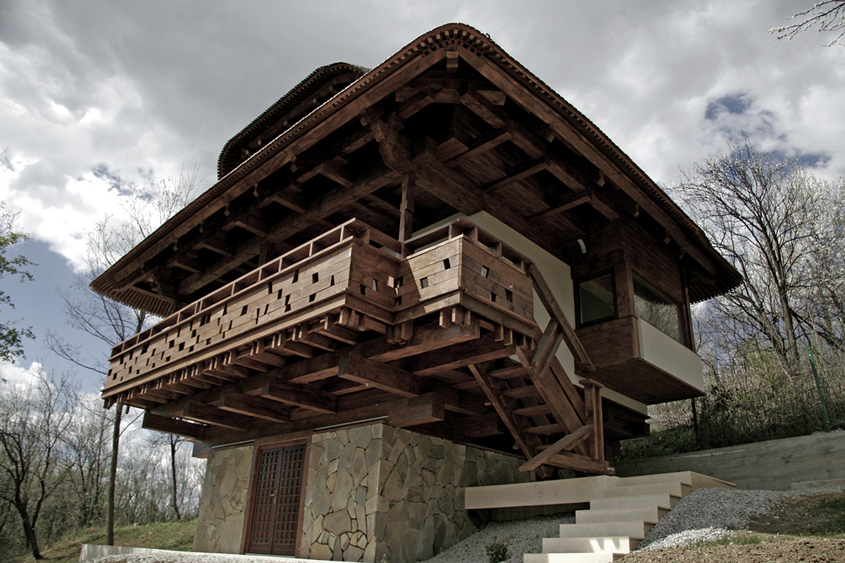 Casa este structurată pe demisol, parter și mansardă. S-a dorit o amprentă cât mai mică la nivelul solului, din varii motive, dintre care și cel al unei amprente energetice mici și aici mă refer la cantitățile de beton și fier-beton încorporate. Astfel se ajunge că pe diagonală la partea din vale să avem aprox 4,5 m de la colțul structurii demisolului la racordul superior al șarpantei de sită. Motivul conceptual al proiectului a fost încercarea de a oferi o altă imagine a arhitecturii tradiționale românești într-o mică fuziune dintre modul oltenesc și arhitectură dou-gong specifică Japoniei, Chinei și Coreii. Structura de lemn a casei este realizată din profile de rășinos masiv (brad/molid) cu lungimi de maxim 8 m delimitate de puterea de debitare a gaterului. Lemnul trebuie să fie tăiat în perioada recomandată și de specialiștii Romsilva respectiv octombrie-aprilie. Mai nou, datorită decalarii anotimpurilor, cred că e mai propice termenul de noiembrie-aprilie. La stâlpii pridvorului s-au folosit profile de larice, acesta având densitatea de două ori mai mare că a molidului.