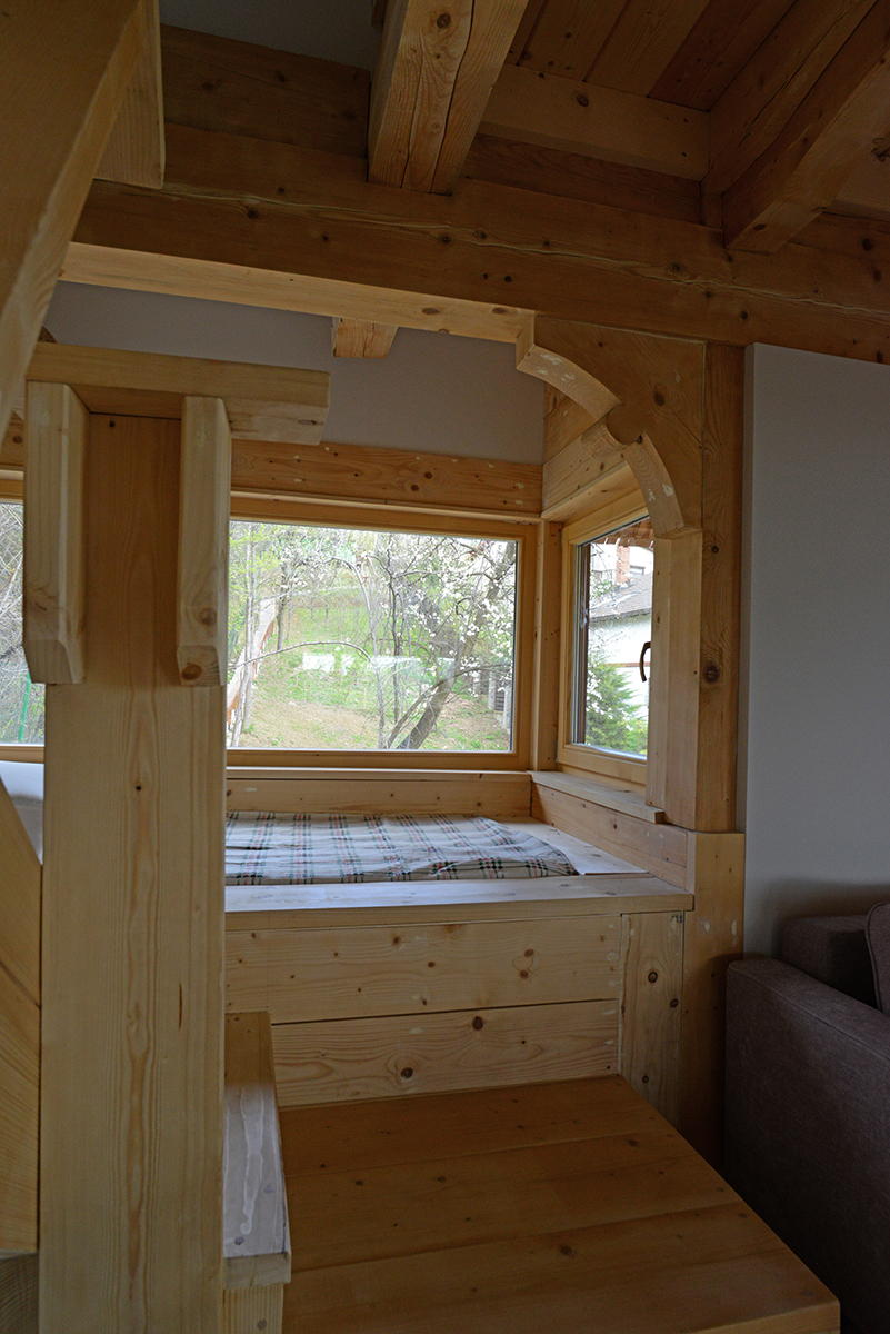 Să revenim la arhitectura arhaică „țărănească” cu înțelepciunea și autenticitatea ei și să punem în evidență un concept oltenesc în care grinda logitudinala a prispei este susținută mai mult de profile de lemn solide ce vin din pereții transversali ai casei și mai puțin de stâlpii prispei. E cazul celor doi stâlpi de larice marginali și exclude cazul stâlpului central ce susține direct grinda pentru a nu fragmenta spațiul interior. Peste această grindă transversală vin niște grinzi perpendiculare ce, spre exterior, capătă sensul de gong, căci peste acestea vin cele șapte dou-ri ce poartă o grindă longitudinală secundară. Rolul acestor suprapuneri structurale este și acela de a ridica cota șarpantei și a expune vizual mai pregnant grinda principală longitudinală care, în multe cazuri, stă în umbră cu toate că aceasta poate avea mesaje și prelucrări artistice specifice. Nu este cazul nostru, pentru că nu am găsit material la dimensiune din larice. Consider că bradul și molidul se comportă destul de impropriu în cazul abordării decorative, fiind cel mult partener la anumite decupaje deco. Cel mai bine se pretează cu siguranță stejarul sau salcâmul, care este cea mai dură specie din Europa (introdusă recent la noi , pe la 1850, cu primele plantații în Oltenia), depășind tisa care este oricum ocrotită.