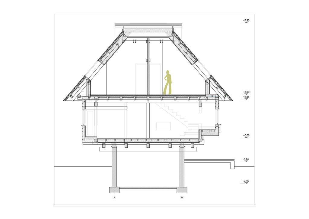 Planul parterului este definit de prispa generoasă și spațiul livingului compus din living cu loc de luat masa, minibucatarie, o baie de serviciu, o seră și un divan (conceptul de „divanul din living” dezvoltat ca un box închis cu sticlă ce participă la activitatea din living, dar, în același timp, se retarge într-un intim dialog cu natură, este împrumutat din arhitectura unor case din Australia). Tot în parter mai există un acces secundar direct în zona de seră și scara de acces către cele două dormitoare de la mansardă.