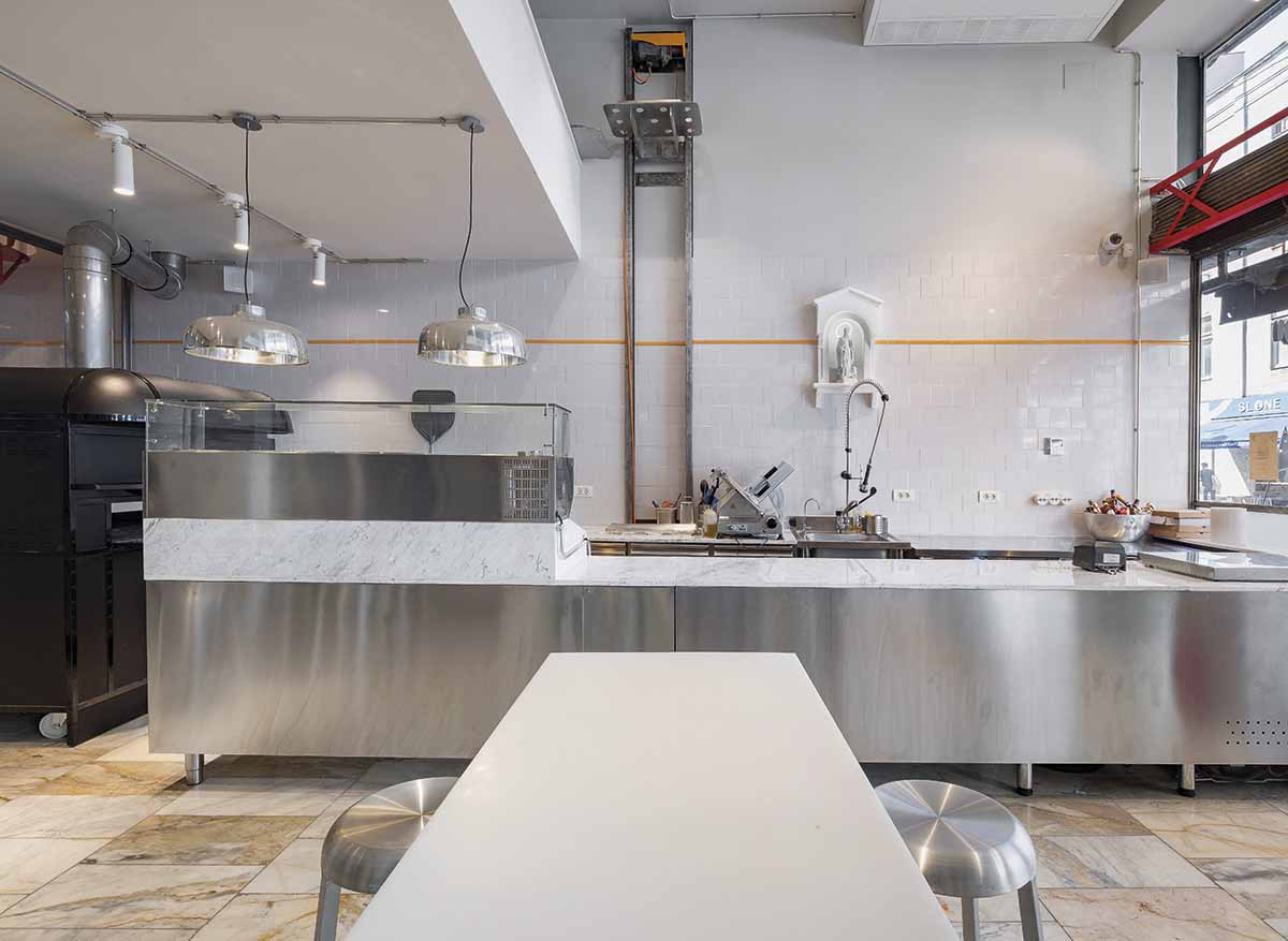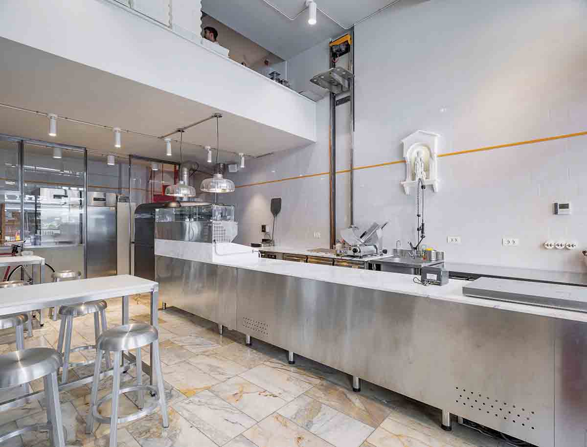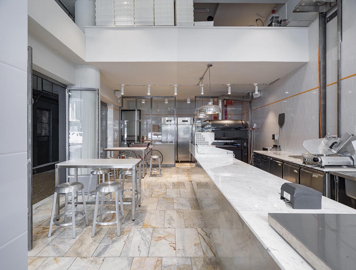 Pe înserat, neon-ul „C”-ului a cărui linie curbă se regăsește și în mânerul ușii de la intrare, spre exemplu, se animă într-un ritm newyorkez, iar vitrajele mari asigură primul nivel de transparență, cel care te face curios să intri și să descoperi. Iar când faci în sfârșit pasul, pătrunzi într-un adevărat laborator, cel al procesului de la A la Z, de la aluat la pizza caldă scoasă din cuptor. Senzația de laborator este susținută de albul omniprezent: pereți, ceramică, blat de marmură, lumină frustă, puternică.