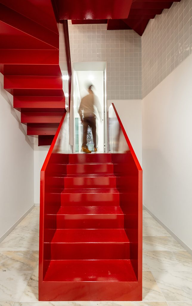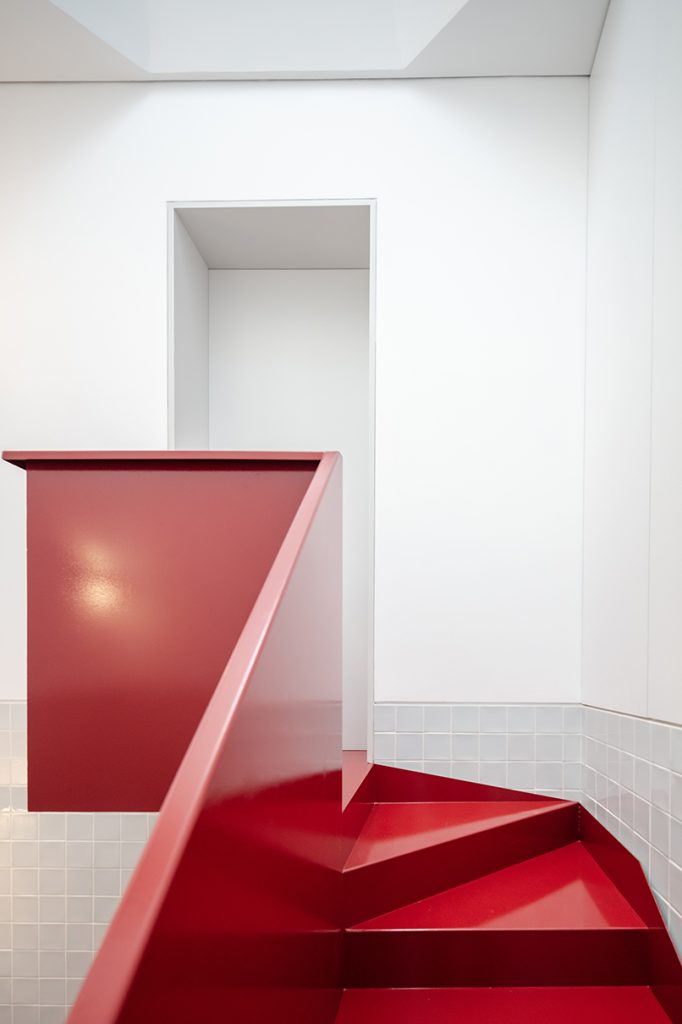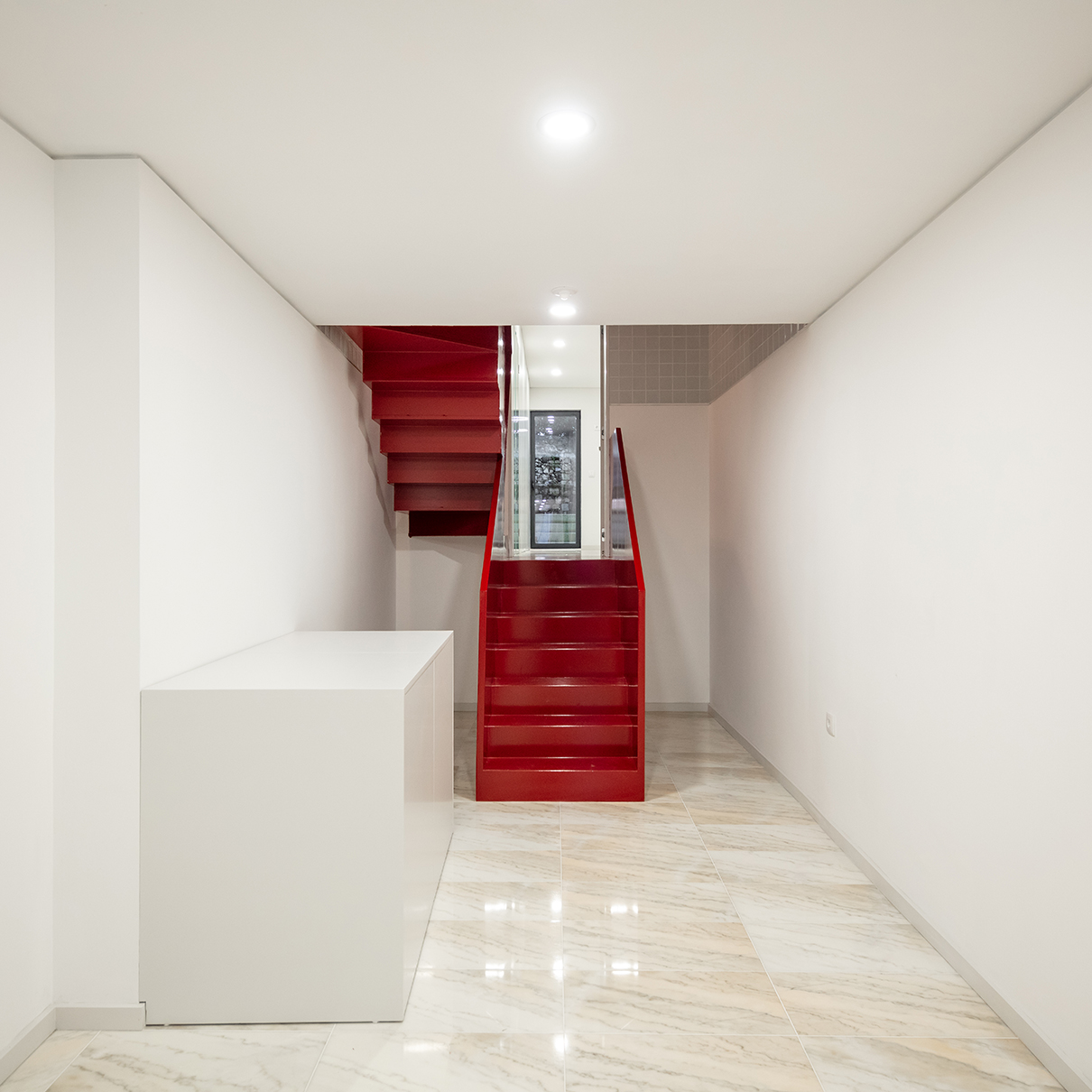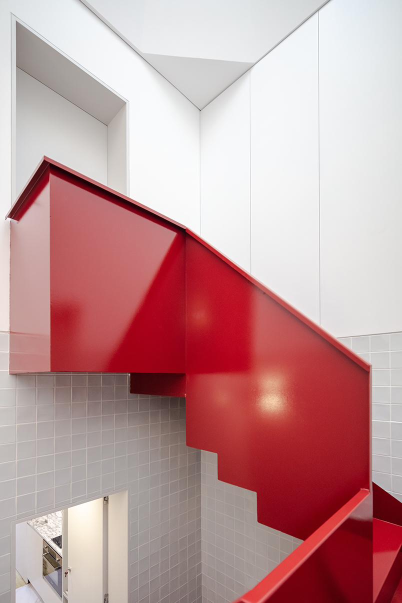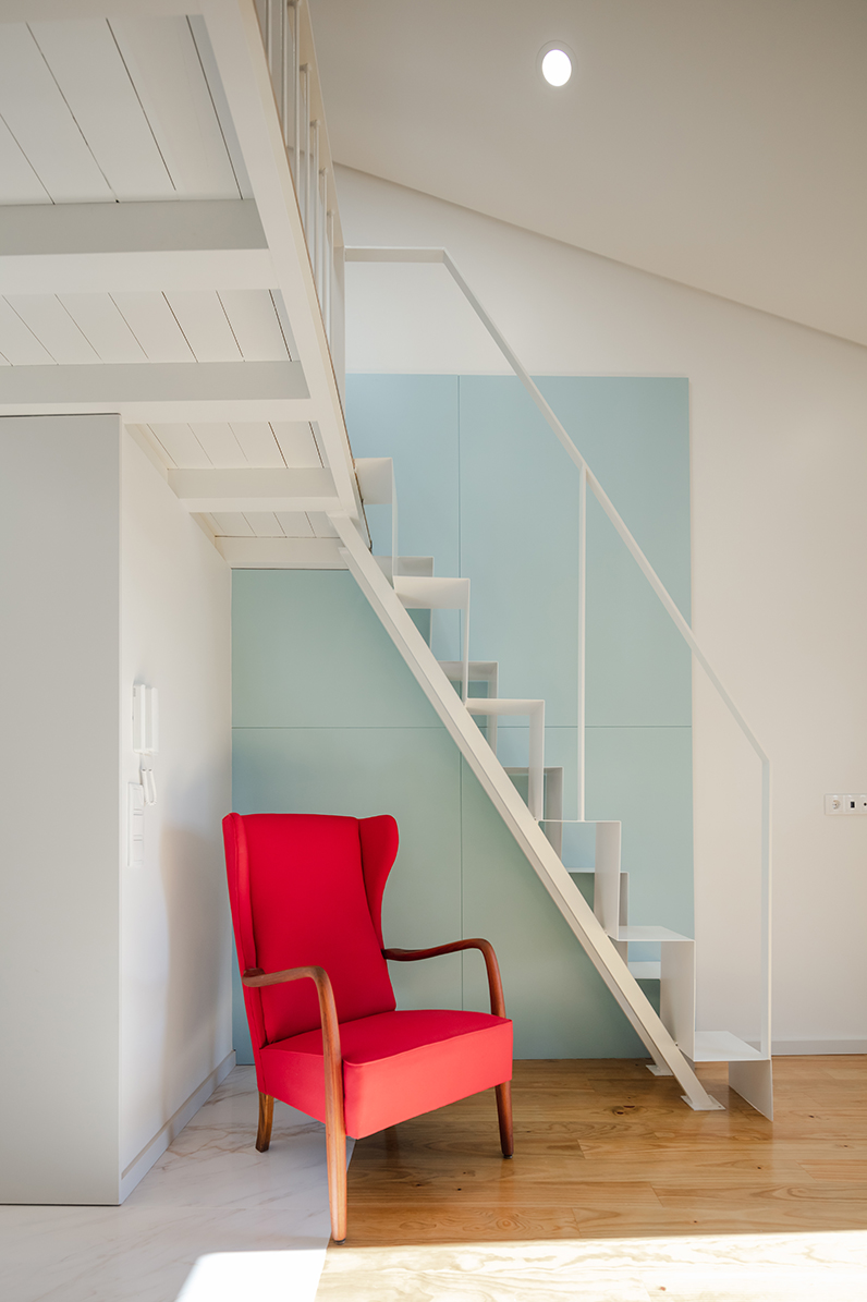 În cadrul clădirii, circulația pe verticală are loc prin intermediul unei scări vopsite în roșu aprins, iluminată natural printr-un luminator piramidal, soluție specifică pentru locuințele urbane din Portugalia. Casa scării este placată parțial cu ceramică.