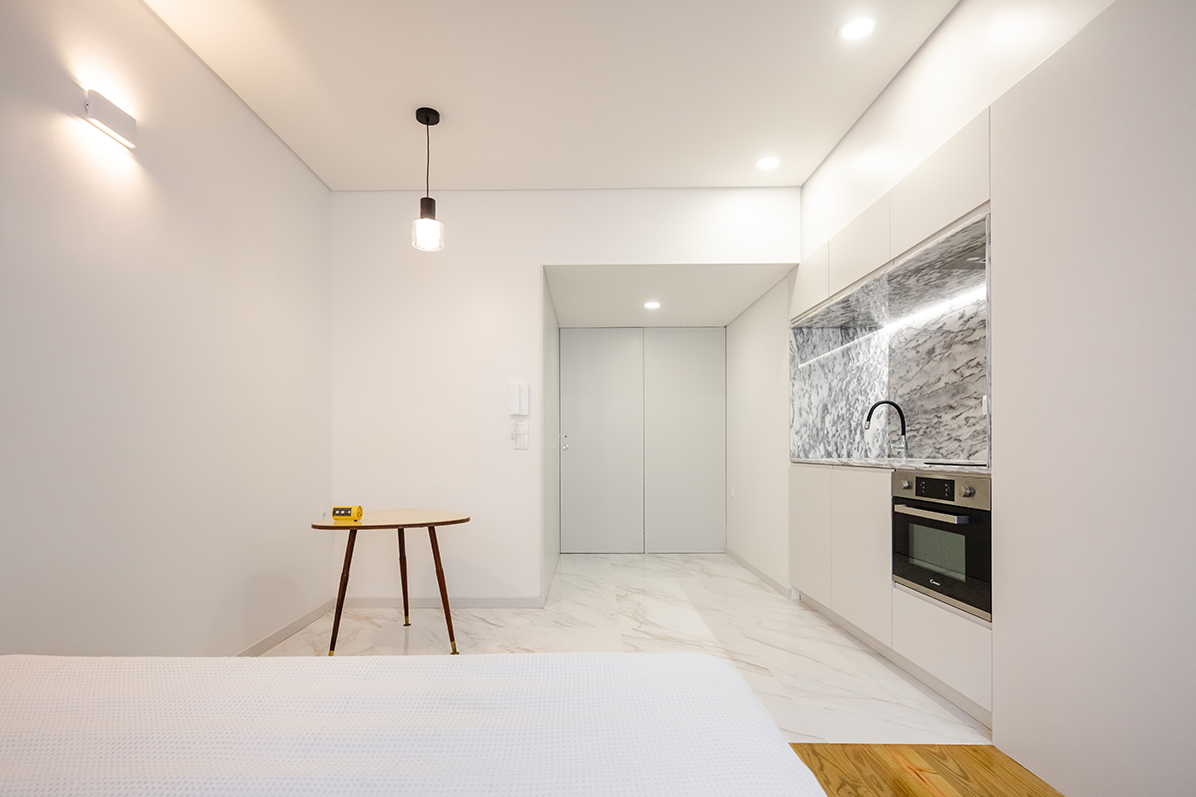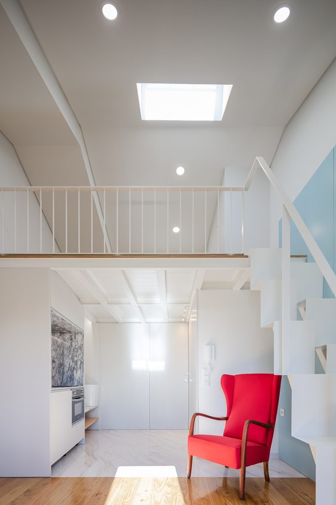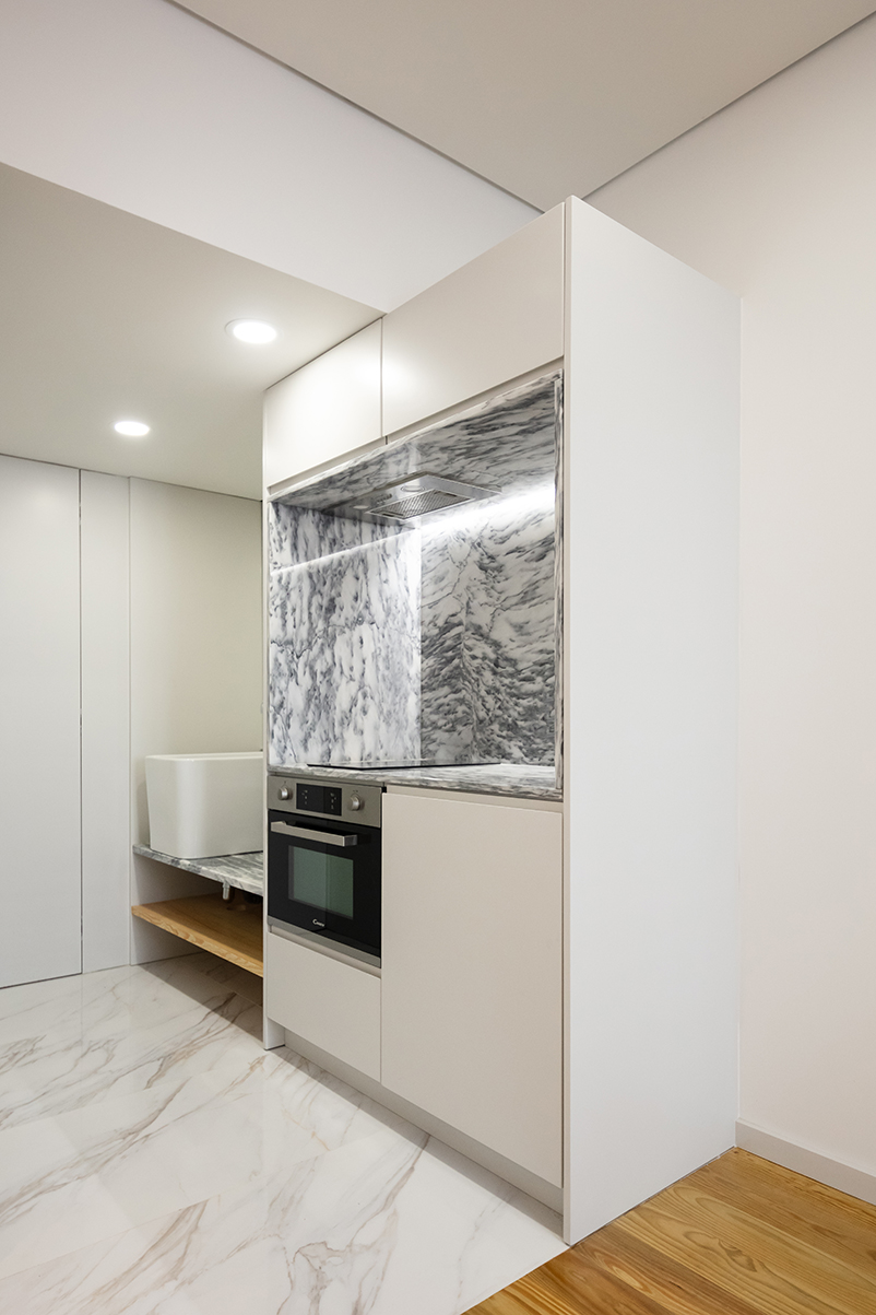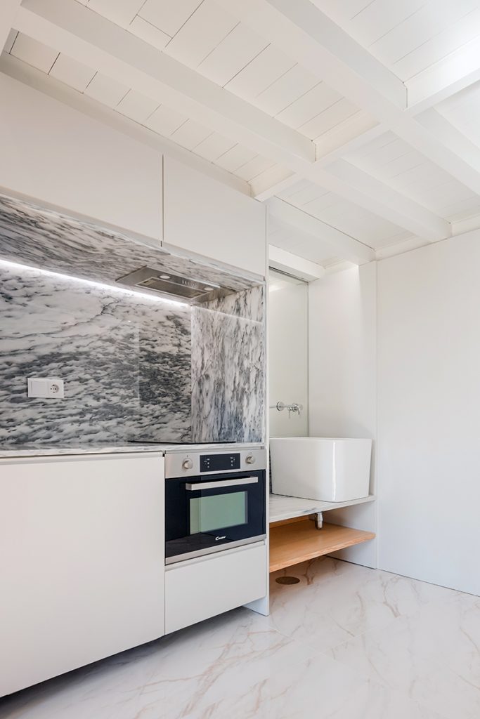 Astfel, un lavoar ceramic generos deservește atât baia, cât și chicineta, și poate fi folosit și pentru spălatul rufelor, în completarea facilităților comune prevăzute la parter. Lavoarul este integrat într-o structură modulară care include și spațiul de depozitare cu oglindă de la intrare, zona de gătit, dressing-ul și un pat adițional, extensibil. Pe latura opusă este prevăzută o baie compactă, prin inserția căreia este definit spațiul holului de intrare. În unele camere, în zona ferestrei dinspre stradă, zidul vechi este lăsat expus, apărând ca decupat din materialitatea nouă și creând un joc captivant între albul neted al pereților și textura pietrei, marcată de trecerea timpului.