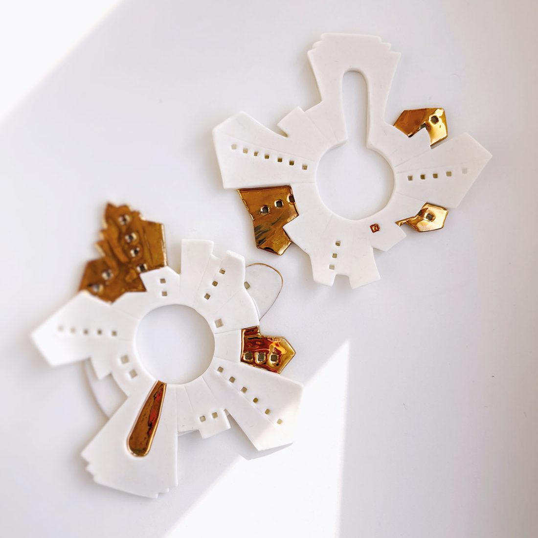 Lucrez în porțelan translucid, pe care îl glazurez parțial – îmi place foarte tare contrastul dat de textura porțelanului mat, neglazurat și accentele perfect lucioase acoperite cu aur pur. Modelez de mână fiecare piesă, folosesc bisturie, spatule de tehnică dentară, scobitori și pensule; fiecare piesă are câte trei arderi în cuptorul de ceramică unde temperatura maximă ajunge la 1 250°C, apoi îmi tai prinderile de broșe, ascut sârme de oțel, înșir perle de cultură. Tot procesul este terapeutic pentru mine.