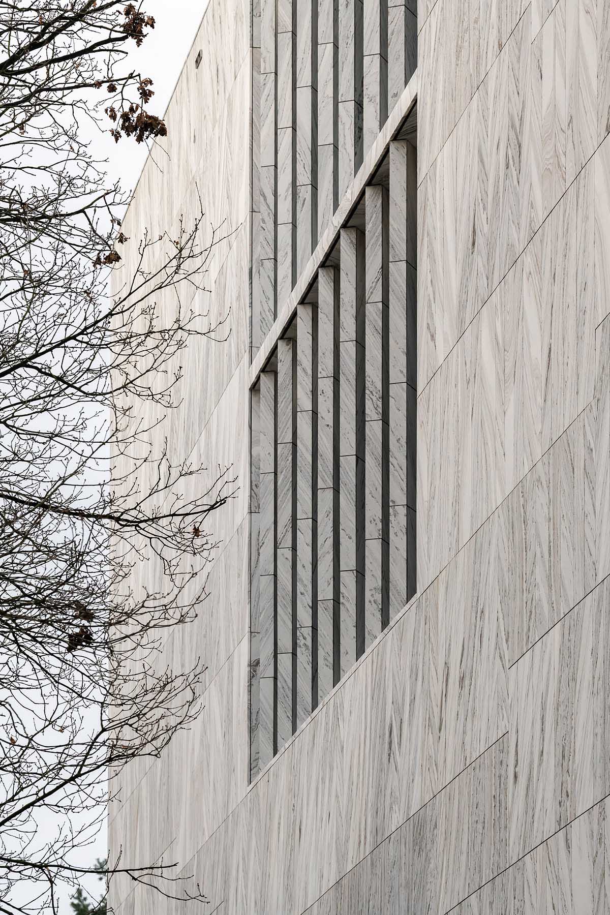 Arhitectura circulară se reflectă în principiile regenerabile ale construcției, fiind utilizate materiale ce pot fi demontate și refolosite în viitoare proiecte. Structura a fost realizată prin punerea în operă a lemnului (4,6 km de grinzi de lemn) într-un sistem constructiv uscat din plăci nervurate din CLT armate cu grinzi care permit deschideri mari (până la 9,2 m) și care, totodată, satisfac cerințele acustice înalte impuse de program. Fațada, de inspirație modernistă, cu goluri ritmate, puternic accentuate, este placată cu piatră portugheză (Muschelkalk), caracterizată prin durabilitate și capacitatea de a fi ușor demontată.