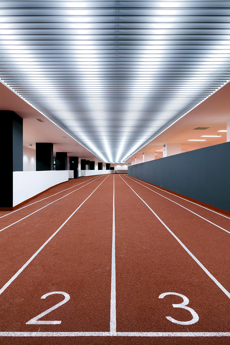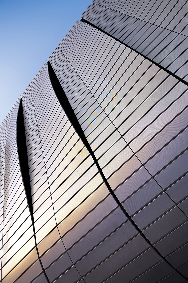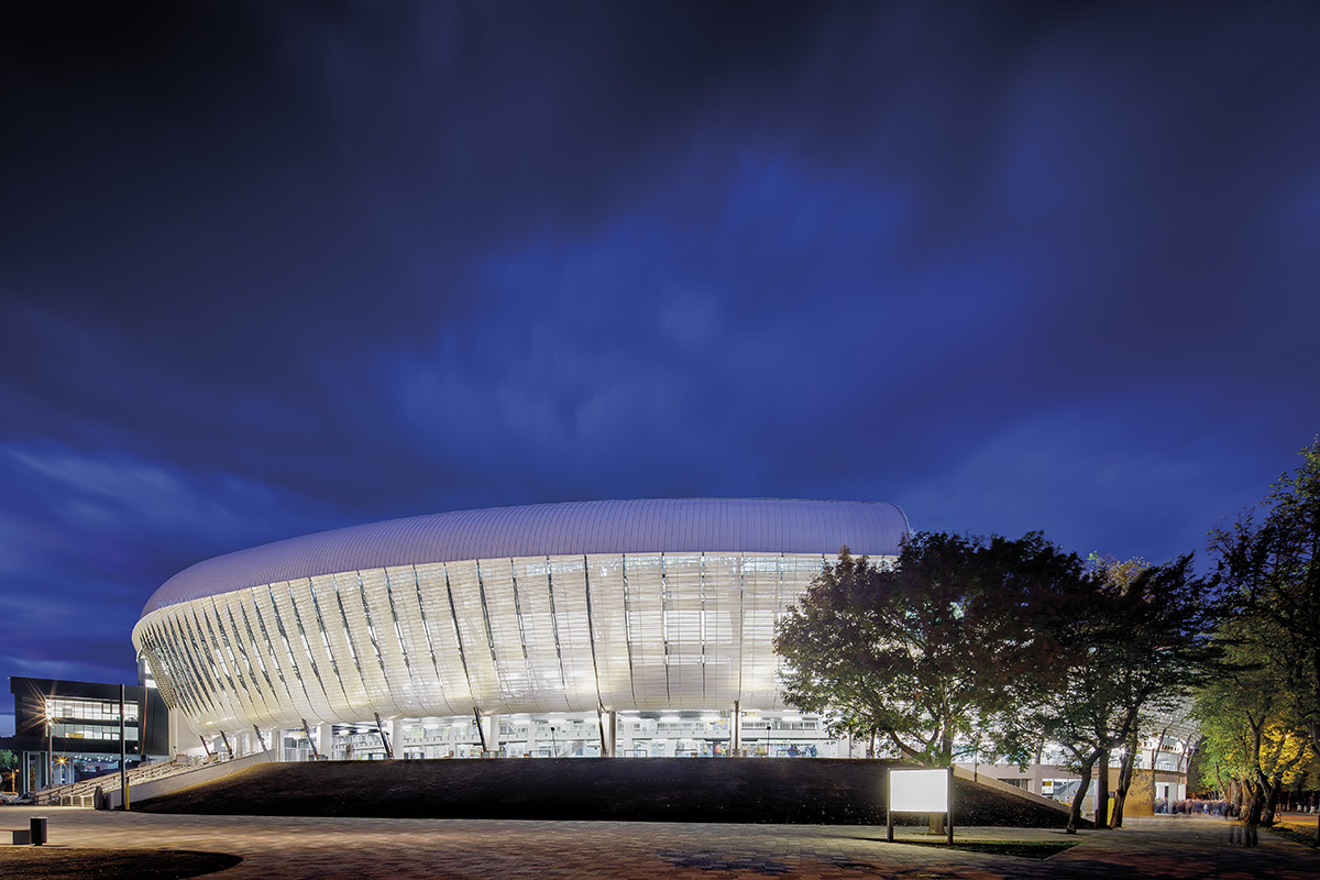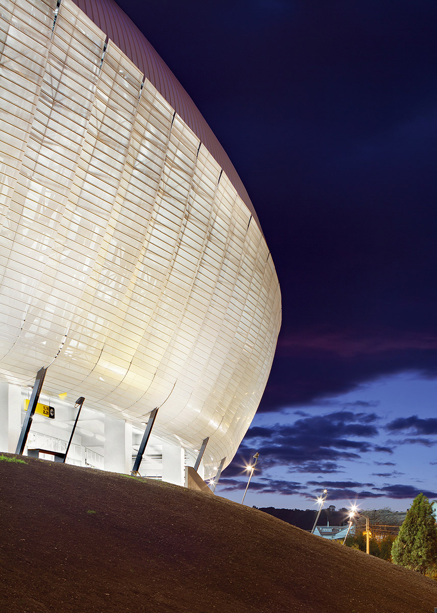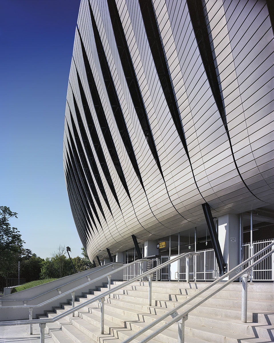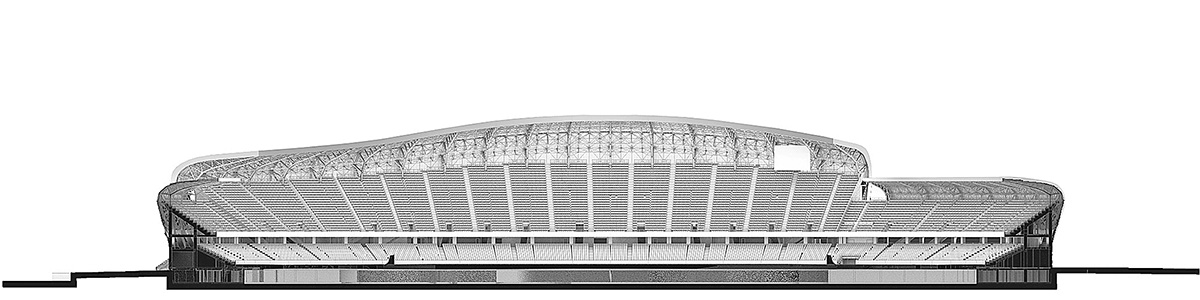 Dinamismul sistemului de acoperire a tribunelor – patru învelișuri concave, curbe atât în plan, cât și în secțiune, simetrice două câte două, diferite ca înălțime și rotite față de axele terenului de joc – ar fi fost suficient pentru a genera un volum spectaculos, însă arhitecții au mers mai departe.