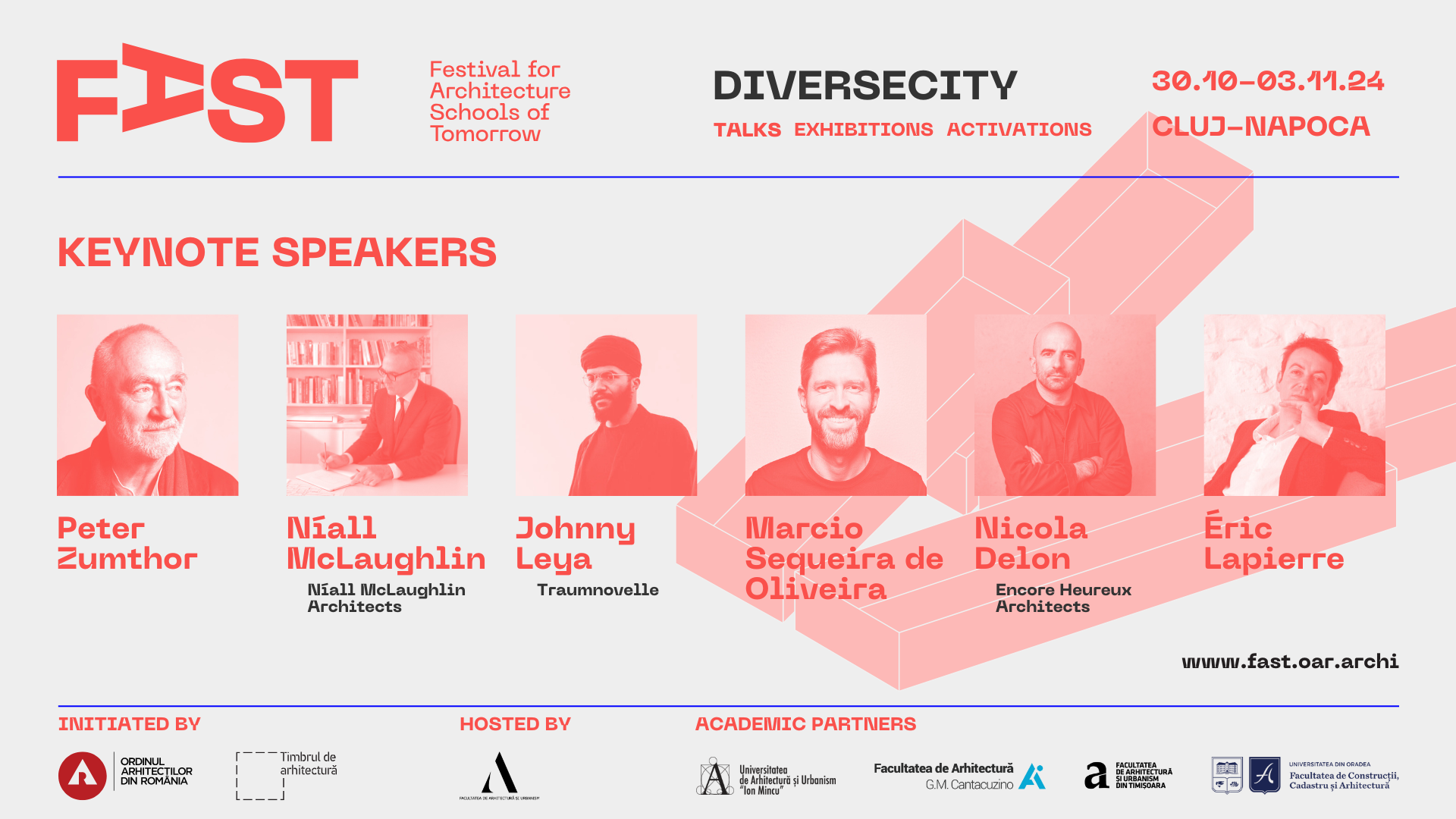 FAST: Festival for Architecture Schools of Tomorrow a fost inițiat în 2023 de Ordinul Arhitecților din România (OAR) pentru a facilita conexiunea dintre educația academică și practica profesională și un răspuns robust al profesiei la evoluțiile și provocările societății contemporane. Evenimentul conectează în premieră la comunitatea profesională și într-un singur eveniment cele cinci centre de arhitectură din România — facultățile din Timișoara, Cluj-Napoca, Iași, Oradea și București — și extinde, totodată, această rețea de cooperare la nivel regional și internațional.
