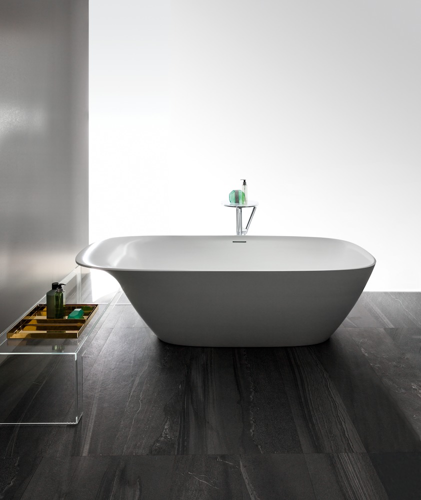 Cele două căzi freestanding, una simterică și una asimetrică, realizate cu rășină Sentec, împacă în mod ingenios și elegant precizia liniilor cu confortul necesar în utilizare. Mobilierul din colecție, suspendat și cu aspect monolit, dezvăluie, odată cu deschiderea ușilor fine cu profil din aluminiu, spațiu de depozitare intim și rațional.
