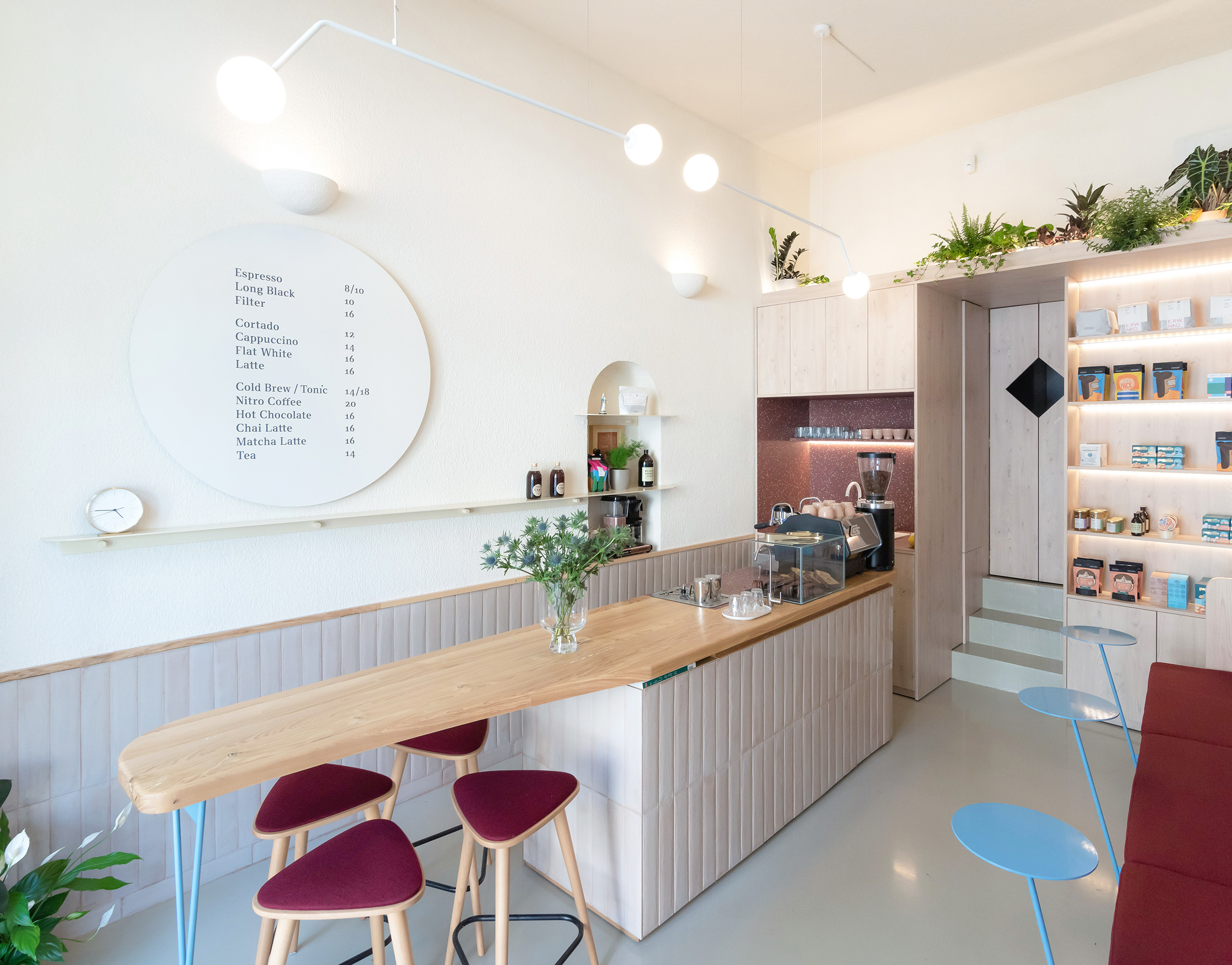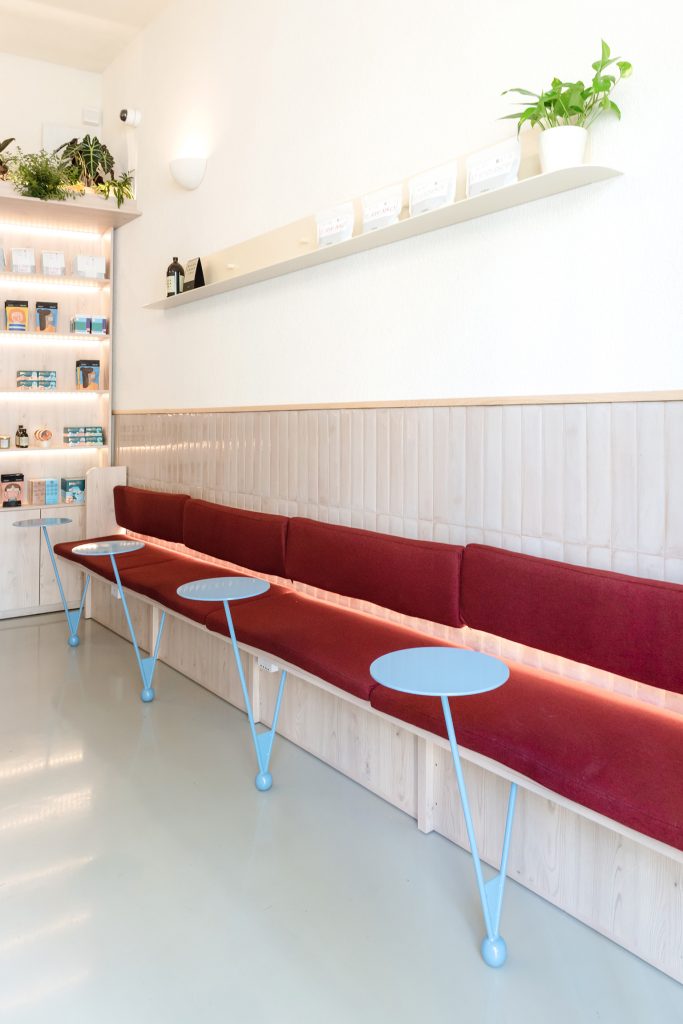Designul se articulează în jurul unui spirit comunitar al celor care se bucură împreună de experiența preparării cafelei și de poveștile care se țes în jurul acesteia. În acest sens, epicentru devine masa comună, barul de espressor continuându-se cu masa oaspeților, care are locuri pe ambele părți. Aceasta este completată, pe peretele opus, de o bancă acompaniată de măsuțe metalice.