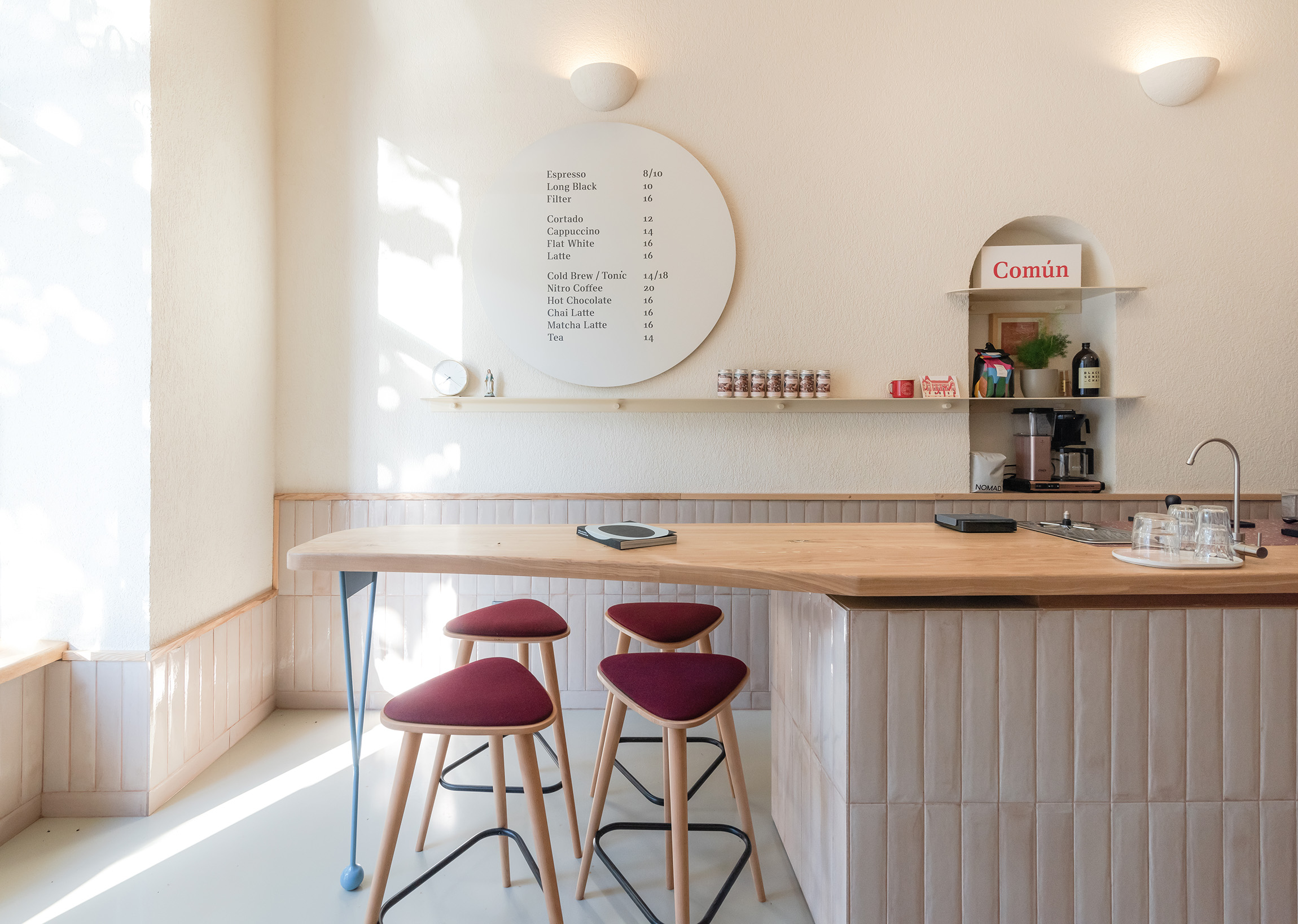 Cafeneaua se insinuează într-un țesut urban al popasurilor zilnice care includ supermarketuri, farmacii, patiserii, magazine etc., instalându-se aproape de Piața Maria în arealul interbelic al orașului. Dezvoltat pe lungime, spațiul Común cafe se deschide către stradă pe 90% din lățime marcând o invitație și o legătură cu orașul și devenind, așa cum sugerează arhitectul, „o cameră la care ai acces din stradă.”