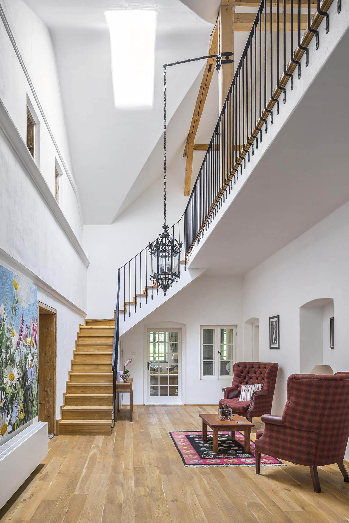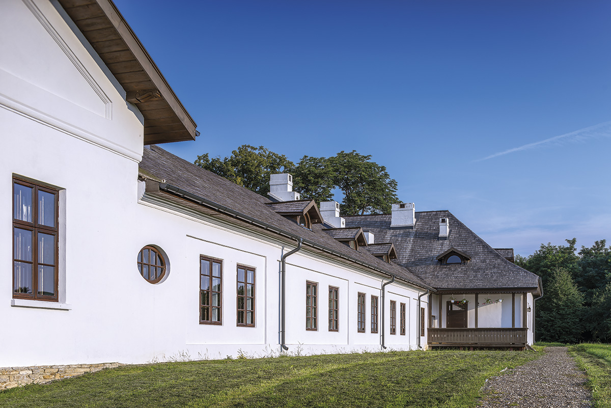 Casa, organizată dintr-un corp lung și două aripi laterale, mângâie orizontala pământului, desfășurându-se în parter și mansardă. Șarpanta, consolidată cu elementele de lemn existente, respectă nealterată geometria acoperișului. Acareturile includ hambarul, organizat pe trei niveluri, mărturisind anvergura agriculturii din epocă.