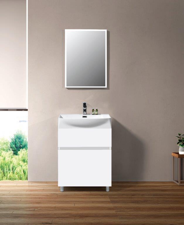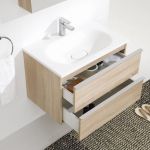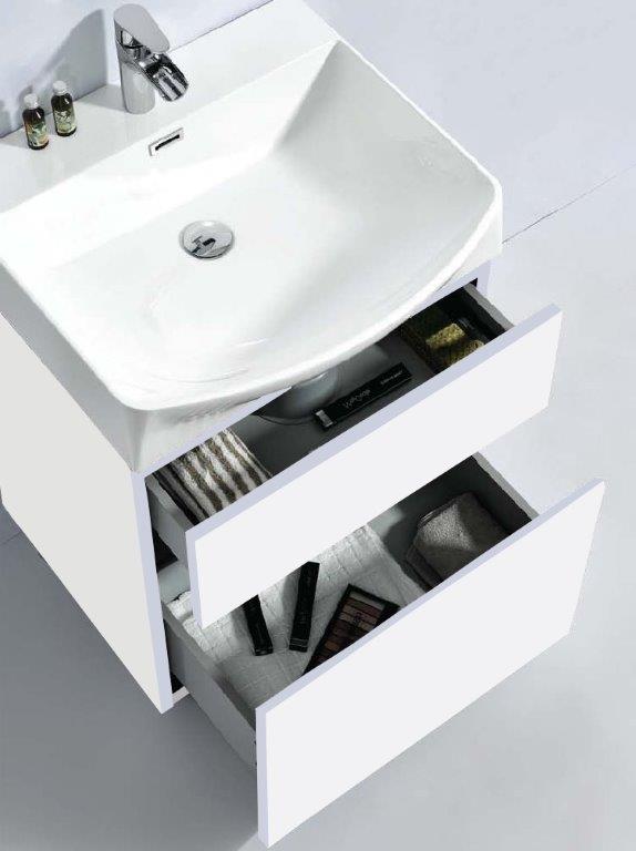Mobilierul suspendat, cu o lungime de 60 cm, cu 2 sertare, este generos pentru dimensiunea sa, din MDF vopsit alb, rezistent la umiditatea din baie. Combinarea mobilierului cu una din cele trei variante de culori ale lavoarului – marmură alb, granulon Buzi și granulon Black Star, va aduce un plus de dinamism băii.