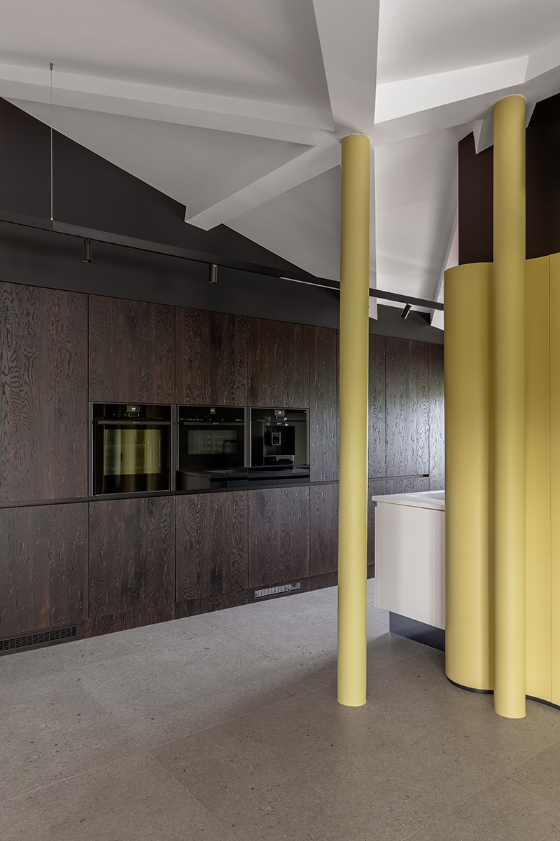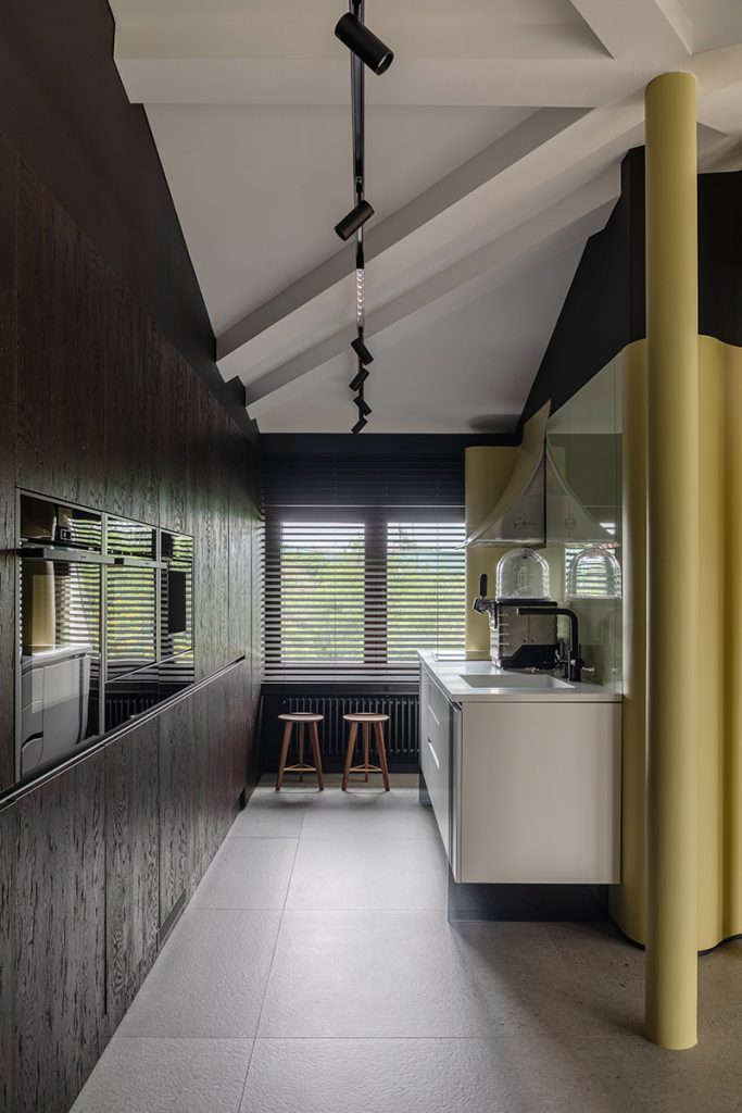 Deși compartimentarea inițială a apartamentului de la mansardă era una bine gândită, arhitecții au hotărât să înlăture complet pereții despărțitori ai bucătăriei și să micșoreze baia de serviciu, pentru a crea un open-space care profită cât mai mult de lumina naturală și de priveliștea copacilor. De asemenea, a fost demolat și un bar semicircular din beton prezent în spațiu, în timp ce partea de gips carton a pereților a fost complet înclouită, rămânând doar structura metalică inițială.