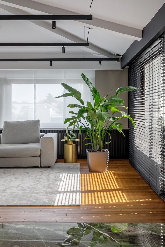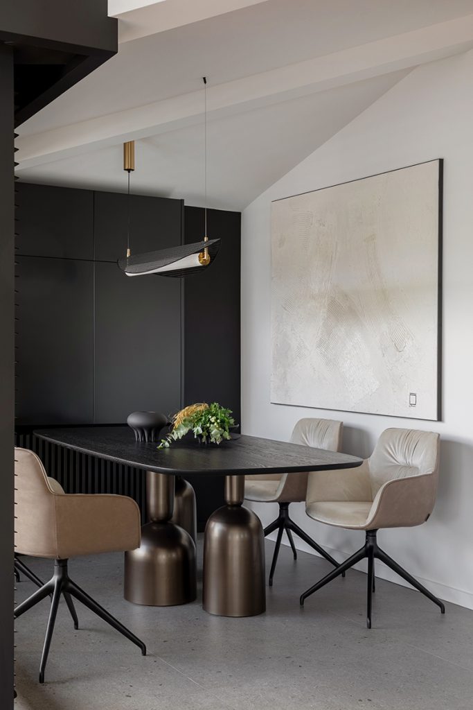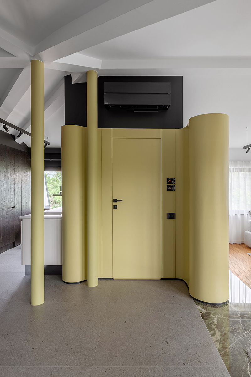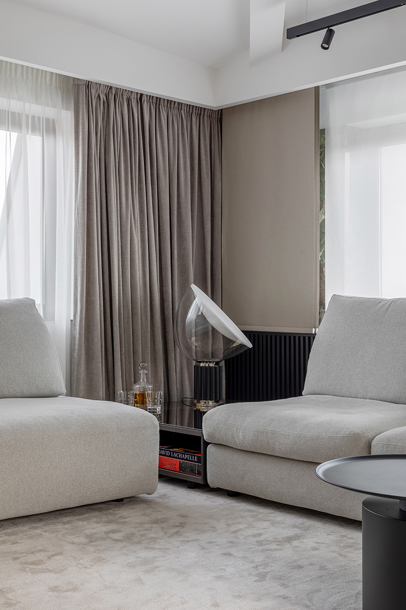 Open-space-ul este organizat în jurul zonei placate cu MDF curbat, care maschează discret intrarea în baia de serviciu și separă vizual bucătăria de living și dining, subliniind, în același timp, prin forma sa, fluiditatea ansamblului. În living, placajul devine suport pentru televizor în zona de media. De asemenea, spațiul cuprinde și multe zone de expunere pentru piesele decorative din colecția beneficiarilor, care includ vase japoneze din secolul 15, ceramică de Horezu de la 1900, precum și un număr impresionant de discuri de vinil.