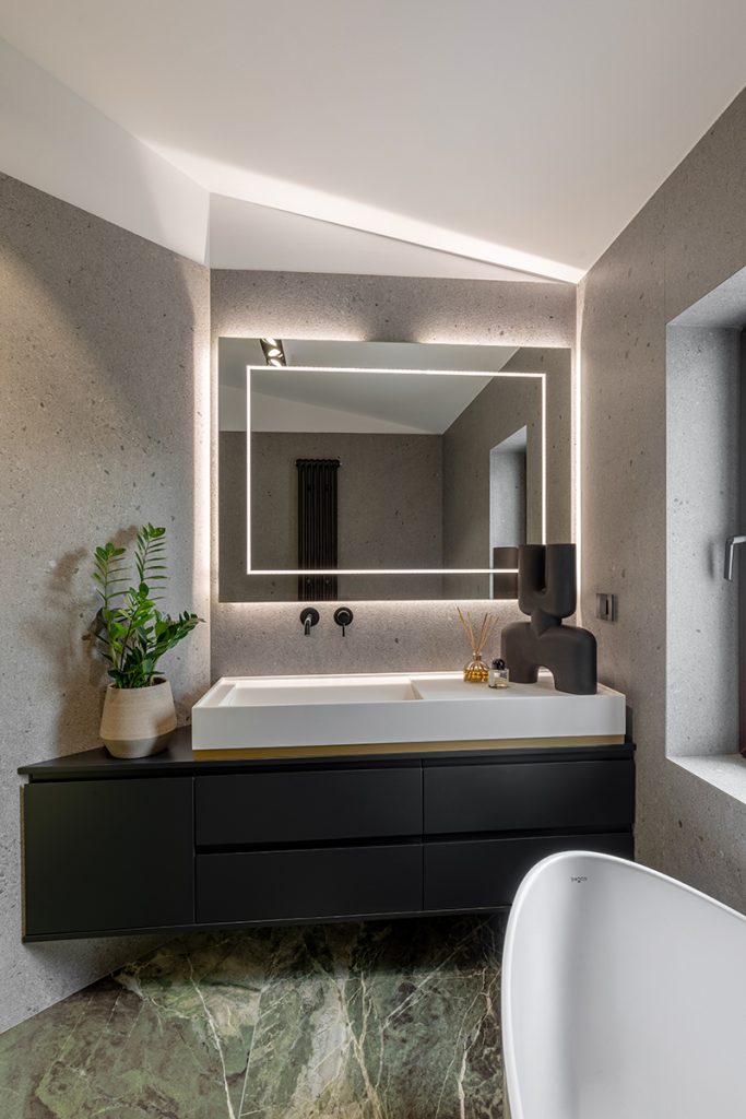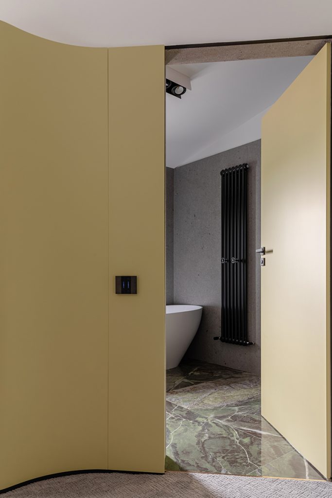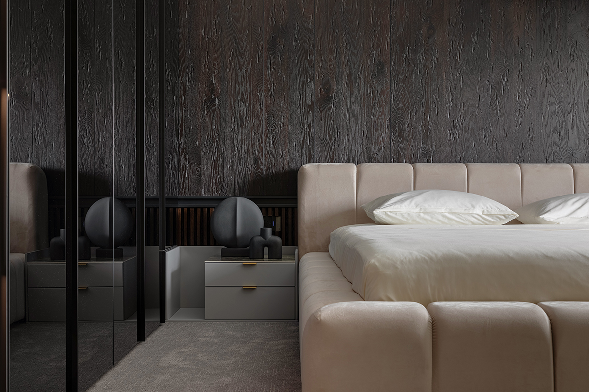 Placările fluide din MDF sunt prezente și în dormitor, unde, de asemenea, maschează accesul către baia adiacentă, iar suprafața mată este pusă într-o relație de contrast cu cea oglindită a dressing-ului.