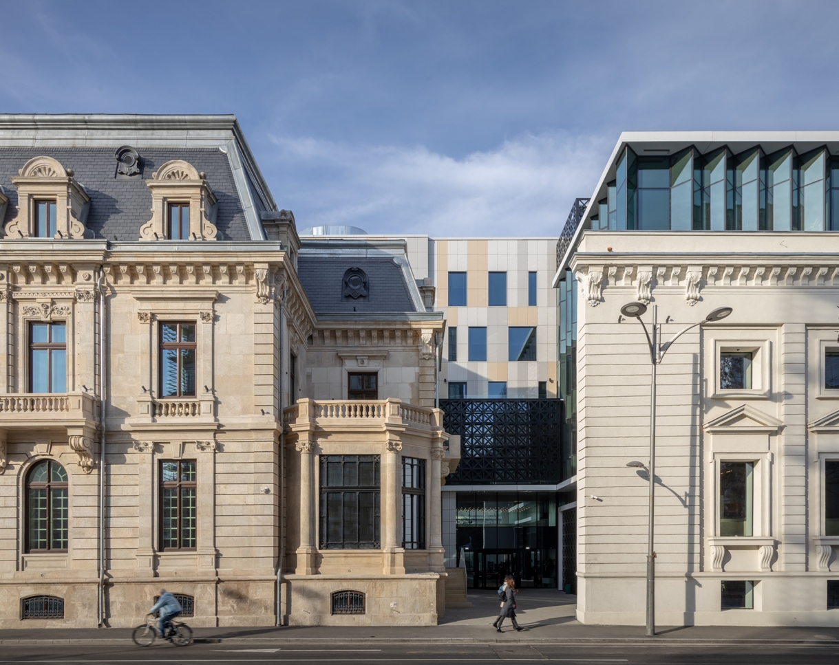 Volumetric, clădirea nouă este rezolvată „în trepte”, legând diferitele părți ale noii structuri de imobilele învecinate. Folosirea unui limbaj arhitectonic unitar ajută la conturarea unui țesut urban eterogen. Fațada nouă din placaje minerale, cu ferestre împușcate, face legătura cu existentul fără să contrasteze, evocând totodată vechea tencuială.