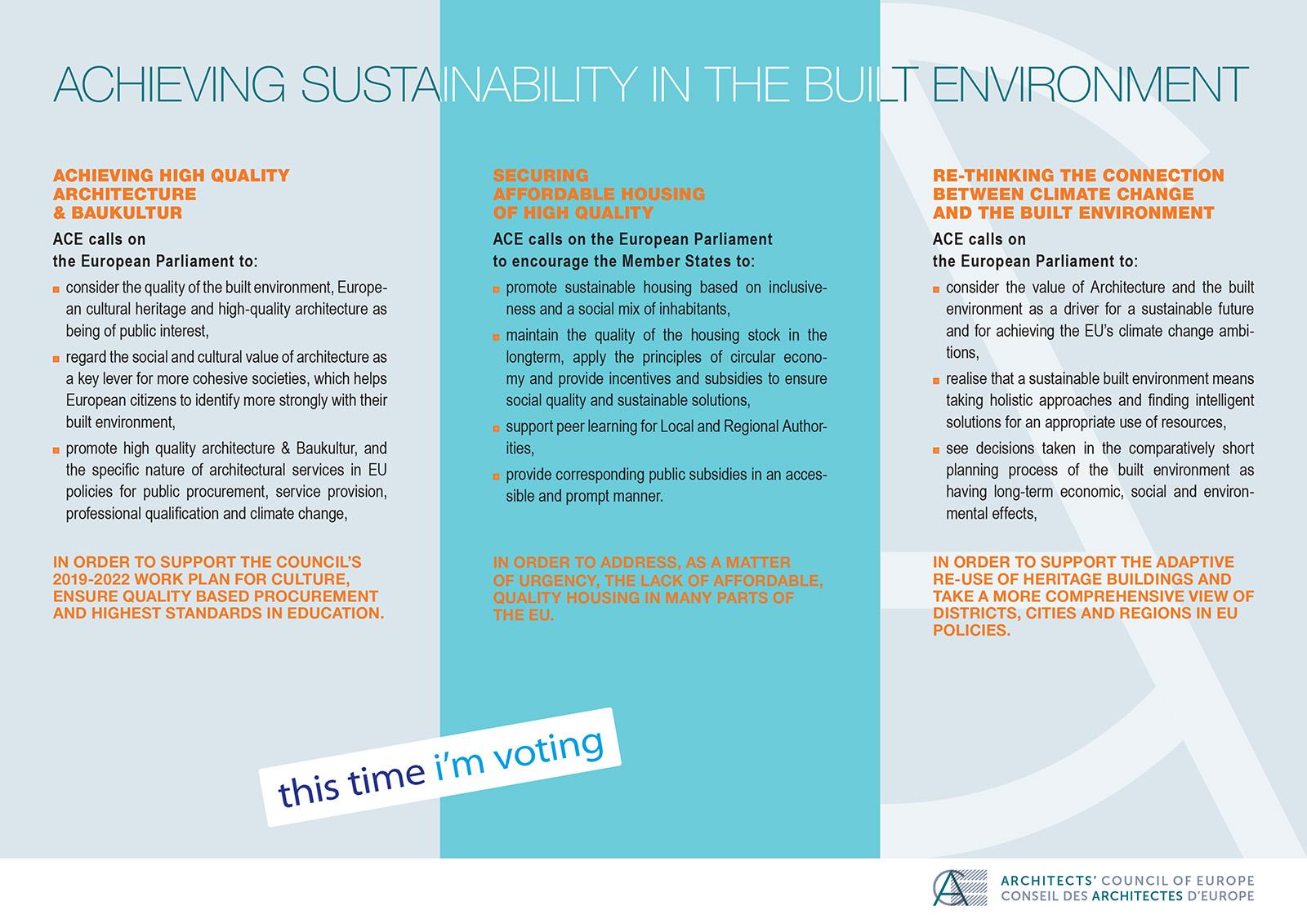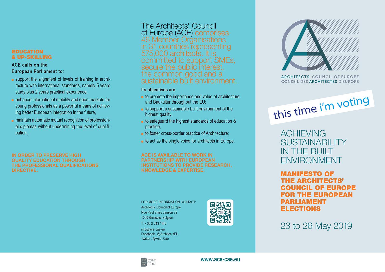 Consiliul Arhitecților din Europa a lansat manifestul „Obținerea durabilității în mediul construit”. Scopul documentului este acela de a promova politicile arhitecturale cu ocazia alegerilor pentru Parlamentul European, care au loc în perioada 23-26 mai 2019.