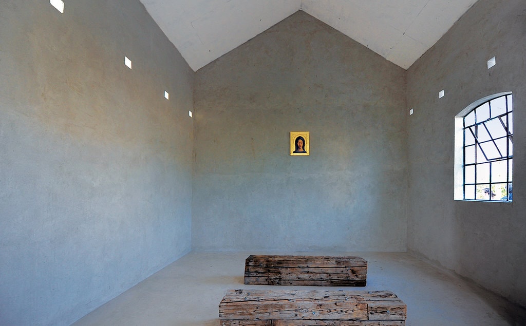 Şi, din respect faţă de patrimoniu, pereţii originari au fost completaţi în zonele lipsă cu cărămizi recuperate, recăpătându-şi astfel şi rolul structural. În plus, o serie de goluri de lumină amintesc de prezenţa fostelor grinzi de susţinere a acope­rişului, elemente care au fost la rândul lor recuperate, curăţate şi transformate în obiecte de mobilier. În ceea ce priveşte noua funcţiune, ea este vizibilă din exterior printr-o discretă deschidere verticală de pe faţada sudică, pe care se conturează o cruce realizată dintr-un profil metalic, similar cu tâmplăria autentică, păstrată la ferestre.