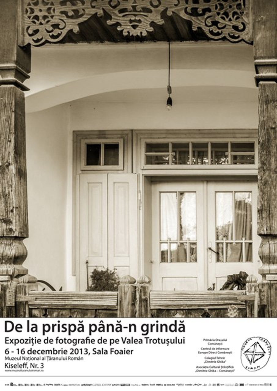 Asociaţia Cultural Ştiinţifică „Dimitrie Ghika – Comăneşti”, Colegiul Tehnic „Dimitrie Ghika”, Centrul de informare Europe Direct Comăneşti, Primăria Oraşului Comăneşti şi Muzeul Naţional al Ţăranului Român vă invită duminică, 8 decembrie 2013, de la ora 12.30, la Sala Foaier, la vernisajul expoziţiei de fotografie De la prispă până-n grindă – meşteşug şi obiceiuri de pe Valea Trotuşului.