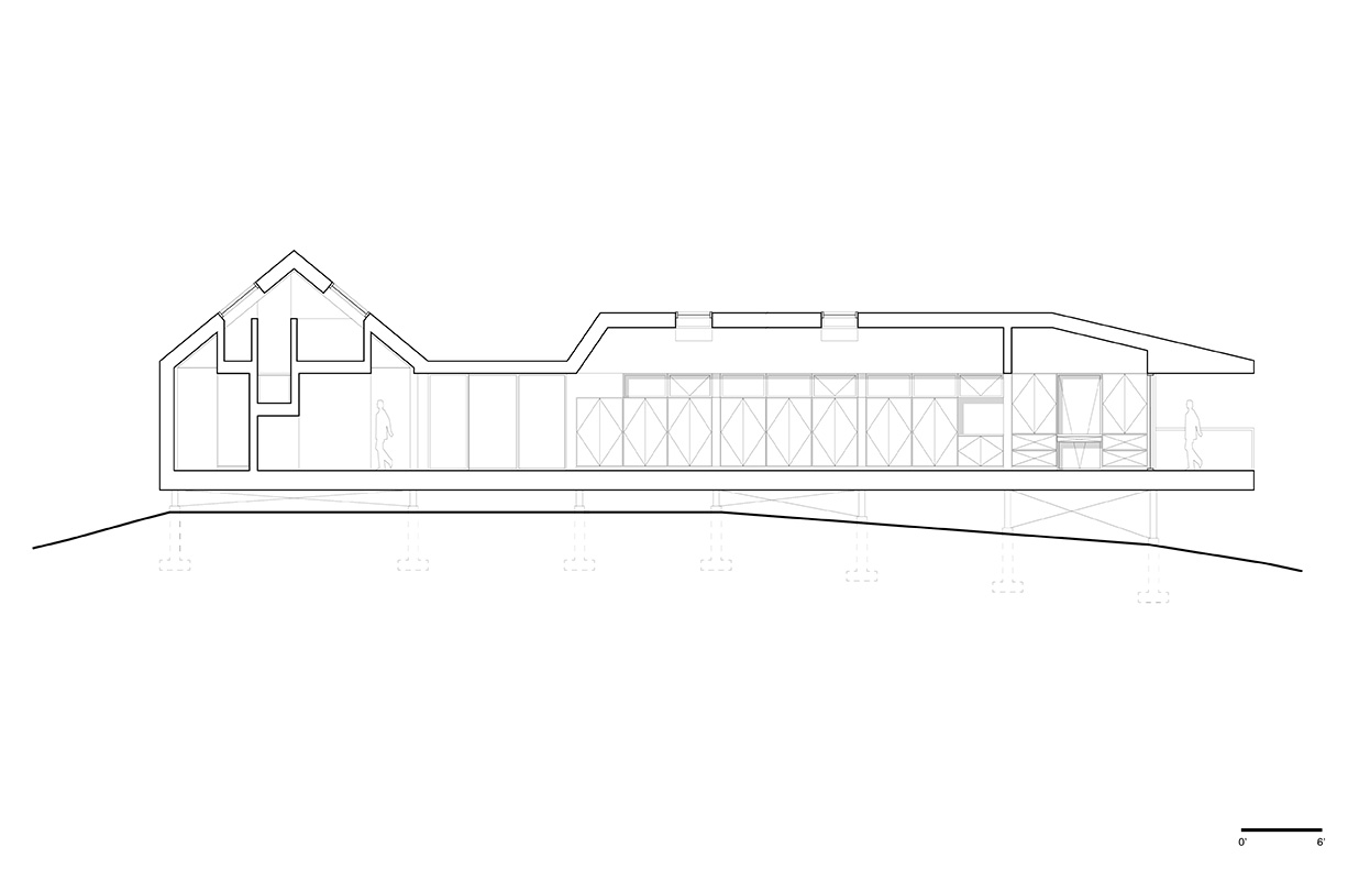 Placate cu lemn atât în exterior, cât și în interior, volumele se sprijină pe piloni de oțel cu flanșă lată, fixați în roca naturală. Această strategie de construcție a redus drastic cantitatea de beton necesară, dovedindu-se o soluție ideală având în vedere natura izolată a proiectului și poluarea pe care betonul ar fi putut-o introduce în ecosistem. De asmenea, elevația permite vieții de pe insulă să se desfășoare nestingherită și creează iluzia unor construcții care plutesc, suspendate în coronamentul arborilor.