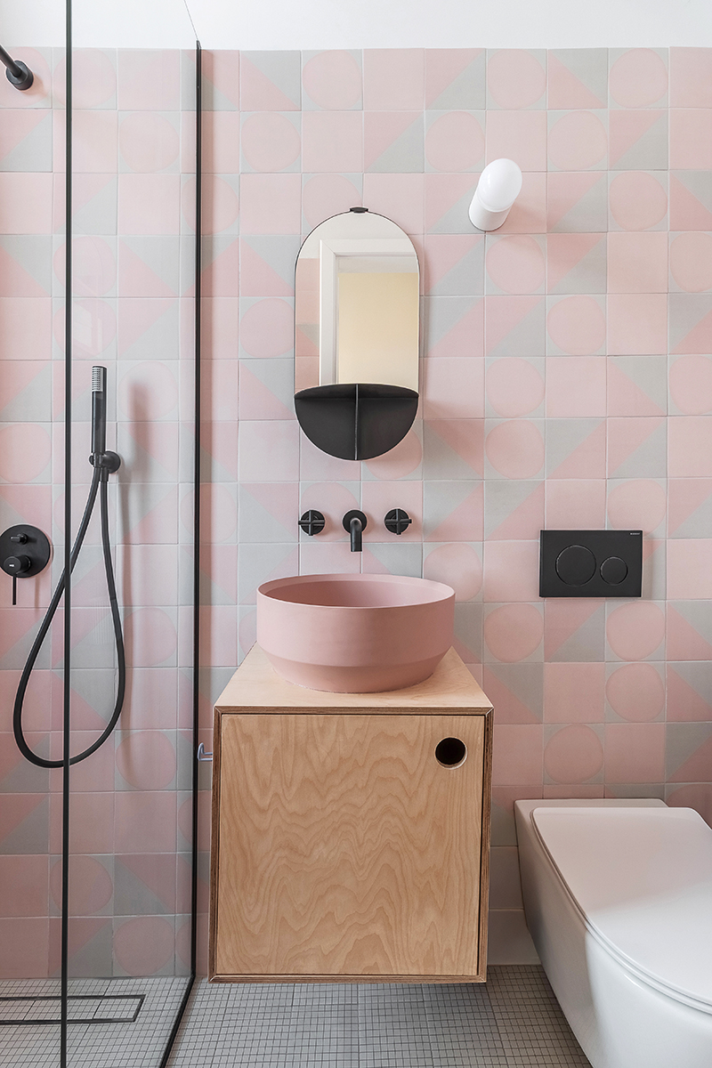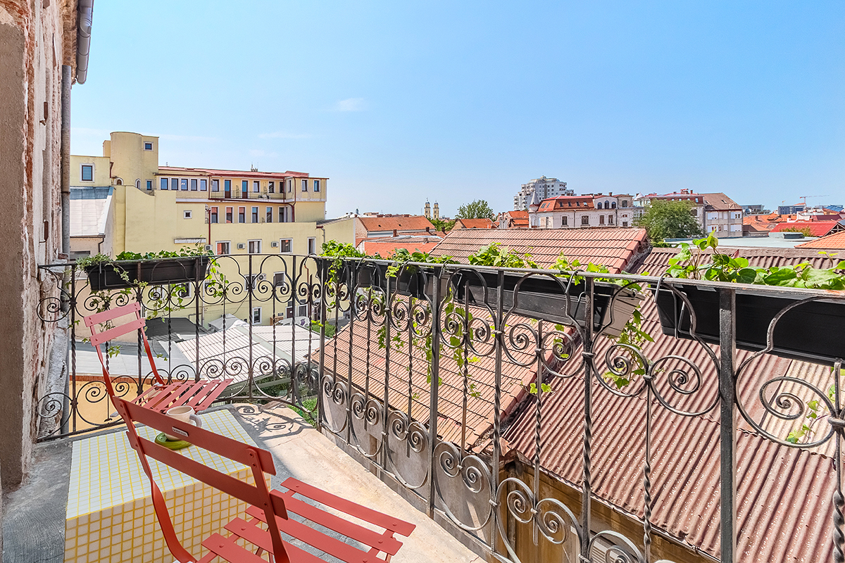 Accesat printr-o ușă marcată de un motiv ondulat, ce răspunde detaliului de pe fațadă, balconul oferă o priveliște spectaculoasă spre apus – de unde și numele proiectului – amplificând senzația de deschidere și luminozitate. Amenajarea este completată de o baie care aduce în spațiu o notă vibrantă și contemporană, prin faianța roz cu forme grafice, în contrast armonios cu bateriile și accesoriile negre.