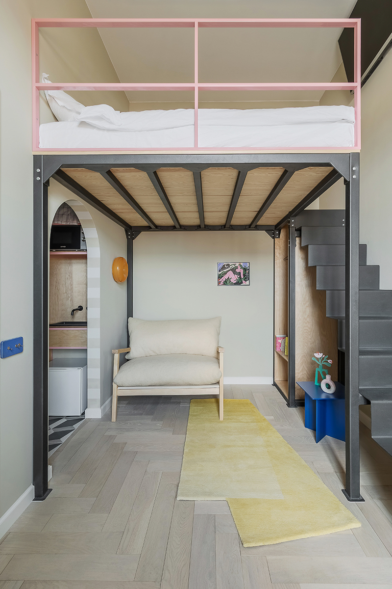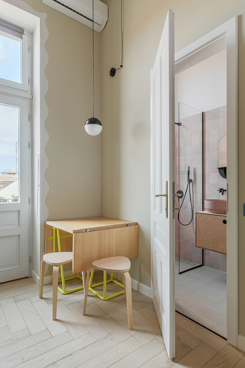 Situat în cadrul istoricei Case Adorján II din Oradea, acest studio de numai 24 mp (inclusiv balconul și mezanina nou introdusă), amenajat în vederea închirierii în regim hotelier, servea, în trecut, drept bucătărie a apartamentului învecinat, The Grand Salon. În cadrul proiectului de amenajare, fiecare metru pătrat a fost planificat cu atenție pentru a maximiza funcționalitatea fără a încărca vizual spațiul, rezultatul fiind un interior contemporan, marcat de accente colorate și detalii jucăușe.