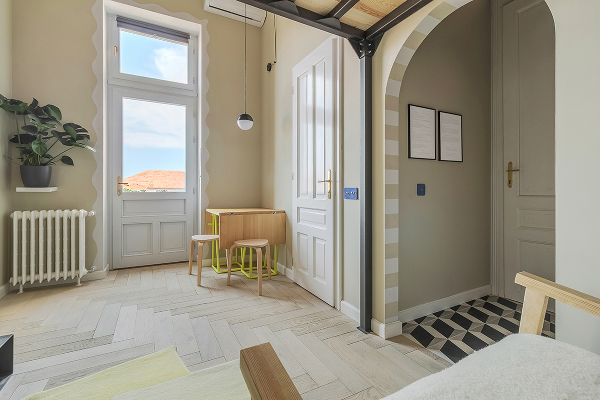 Într-o primă fază a proiectului, spațiul existent a fost refăcut în totalitate, singurul element original păstrat fiind ușa de la intrare, care a fost atent recondiționată. Fiind vorba de o clădire istorică, celelalte uși – cea interioară și cea spre balcon -, precum și ferestrele, au fost realizate la comandă, conform planurilor autorizate de fațadă.