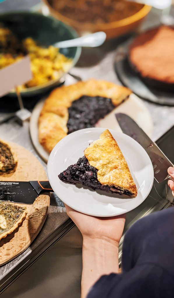 Meniul nostru de deserturi e tot mai extins de la o lună la alta, pentru că ne place să experimentăm, și apoi nu ne mai îndurăm să renunțăm la câte un preparat de care ne-am îndrăgostit. Noroc cu anotimpurile – astfel ajungem să mai rulăm o parte din ele. De exemplu, tartele noastre rustice, care sunt acum umplute cu mere și scorțișoară sau pere și cardamon, urmează să fie înlocuite de altele cu căpșuni, caise, afine, piersici, smochine – pe măsură ce acestea vor apărea în sezon. Altfel, niciodată nu ne lipsește din meniu ceva cu ciocolată – Flourless Chocolate Cake, Brownie Cookies cu sare Maldon, ceva super-aromat – Oasis Cake însiropată cu miere și șofran și presărată cu fistic, ceva foarte simplu și confortabil – Almond Cake cu mere și Amaretto. Pentru că încercăm să acoperim cât mai multe gusturi și preferințe, avem acum în meniu și deserturi fără gluten – Mohnkuchen, fără lactoză – Pistachio Bread, fără zahăr – muffin cu zmeură, ghimbir și cardamon, sau de post – Vegan Brownie cu nuci, merișoare și ulei de cocos.