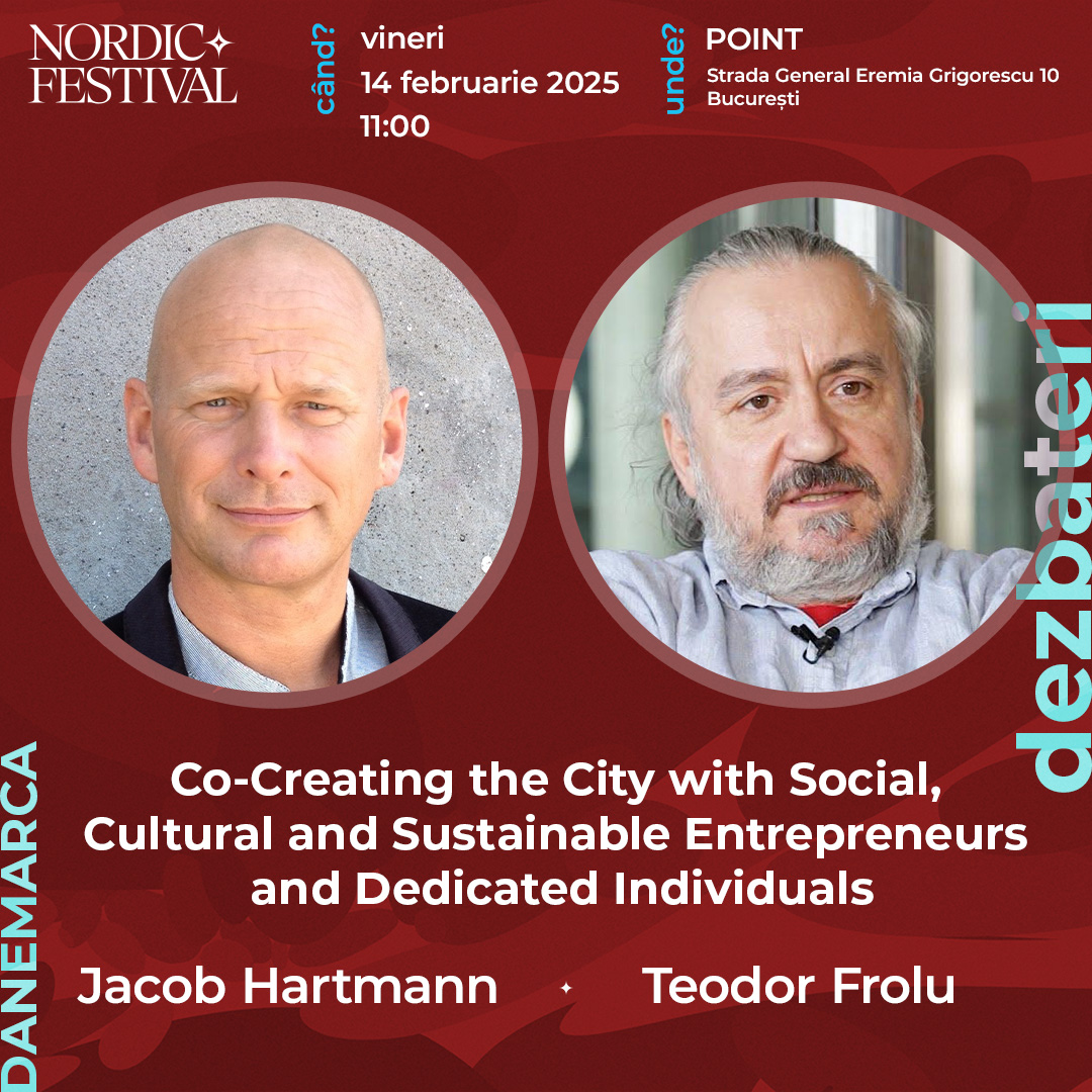 Jacob Hartmann, consilier municipal și activist specializat pe dezvoltare durabilă, sustenabilitate și tranziția ecologică, va povesti despre dialogul pe care îl creează între comunitățile orașului Copenhaga. Rolul său crucial în medierea și facilitarea colaborărilor dintre locuitorii capitalei daneze (ONG-uri, antreprenori independenți, companii) și municipalitate, prin intermediul programului de co-creație și bugetare participativă Sharing Copenhagen, va fi explorat alături de Teodor Frolu, arhitect cu o bogată experiență în industriile creative și sectorul neguvernamental.