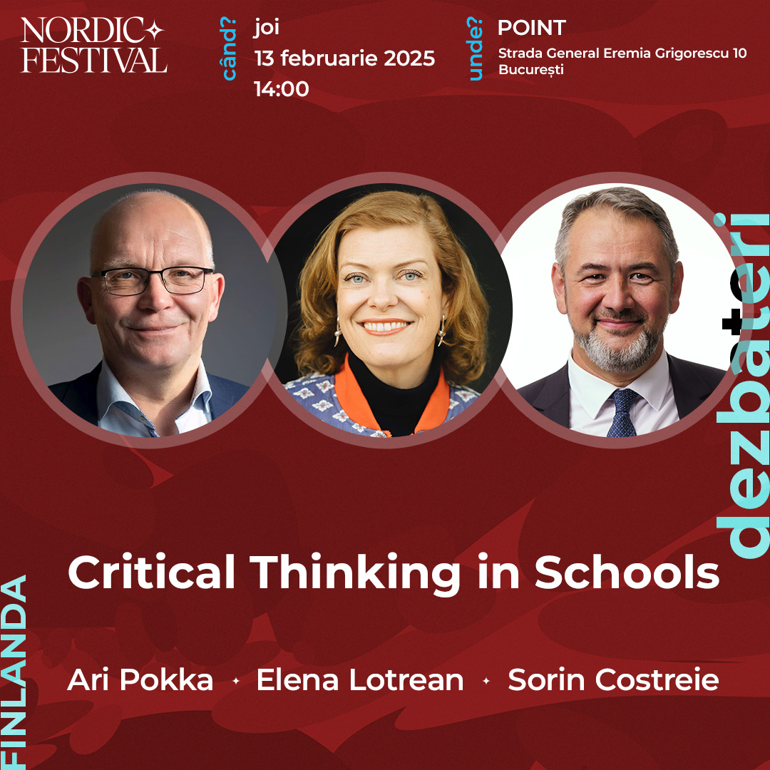 Ari Pokka, consilier educațional, Director General al Institutului Finlandez pentru Educație și fost Președinte al Asociației Finlandeze a Directorilor Școlari, va dialoga cu Elena Lotrean, fondatoare a Școlii Româno-Finlandeze ERI Sibiu și a Finnish Teacher Training Centre, și Sorin Costreie, profesor de gândire critică la Facultatea de Filosofie, Universitatea din București, despre formele pe care le poate lua educația, cu un focus pe experiența lor în promovarea gândirii critice în școli. Pornind de la sistemul de educație finlandez, cei trei vor vorbi despre provocările dezvoltării unui sistem educațional coerent, racordat la tehnologia prezentului, atrăgător pentru noile generații.