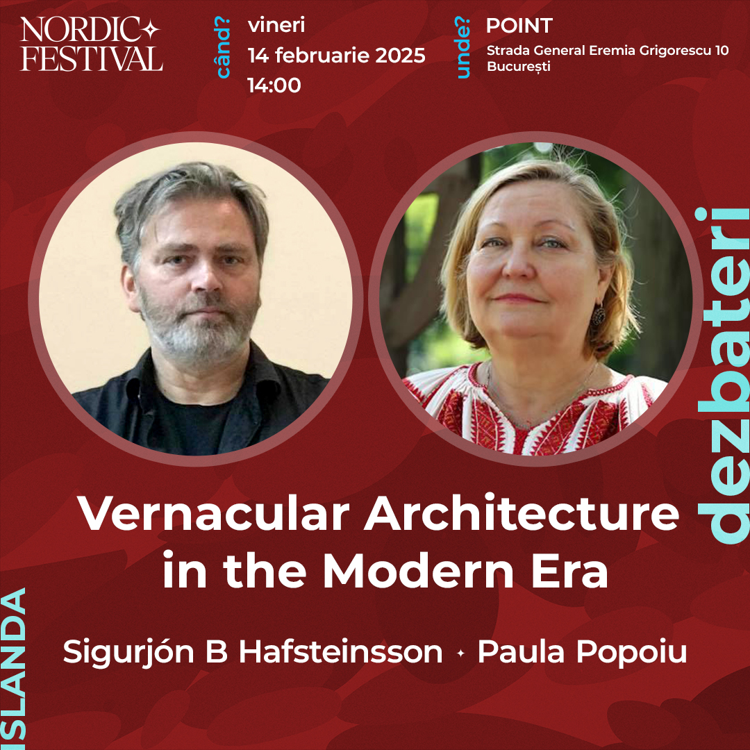 Sigurjón B Hafsteinsson, profesor și cercetător la Universitatea din Islanda va discuta cu publicul, alături de Paula Popoiu, director general al Muzeului Național al Satului „Dimitrie Gusti”, despre importanța și provocările prezervării și revitalizării patrimoniului cultural, îmbinând perspectiva arhitecturală cu cea antropologică, cu accent pe tema arhitecturii vernaculare.