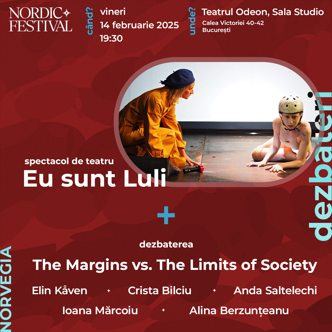 Vineri, 14 februarie, ora 19:30, Teatrul Odeon, Sala Studio – Spectacol de teatru „Eu sunt Luli”, urmat de dezbaterea Despre marginile și limitele societății / The Margins vs. The Limits of Society