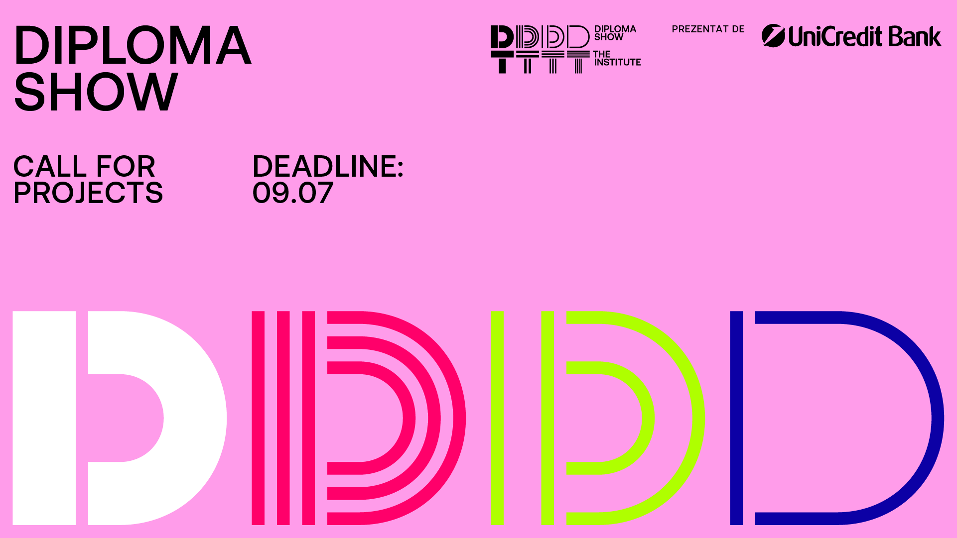 Este deschis apelul de proiecte pentru DIPLOMA Show, organizat de The Institute și prezentat de UniCredit Bank, care va avea loc anul acesta între 6 și 15 octombrie 2023. Până la data de 7 iulie, absolvenții își pot înscrie online lucrările de diplomă pentru a fi prezentate la festivalul de la Combinatul Fondului Plastic.