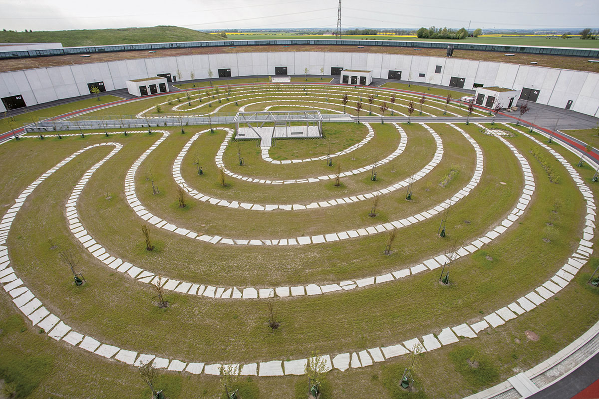 În laborator, asigurarea stabilității traiectoriei particulelor este absolut necesară. În afara lui, uniformitatea trebuie evitată: crearea unor pante susţinute de suprafeţe cât mai haotice este necesară pentru a atenua vibraţiile solului generate de autostrada din imediata apropiere a laboratoarelor. Contrastul dintre forma simplă de cilindru a clădirii care conține laboratoarele şi forma dinamică a terenului devine, paradoxal, unul din motivele pentru care cele două sunt percepute atât de uşor împreună.