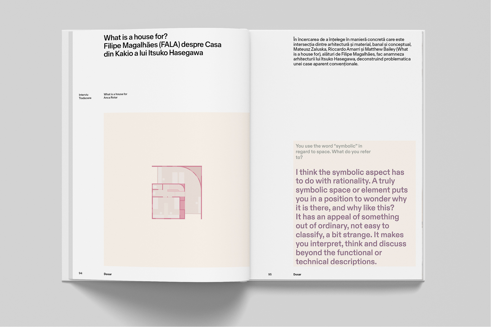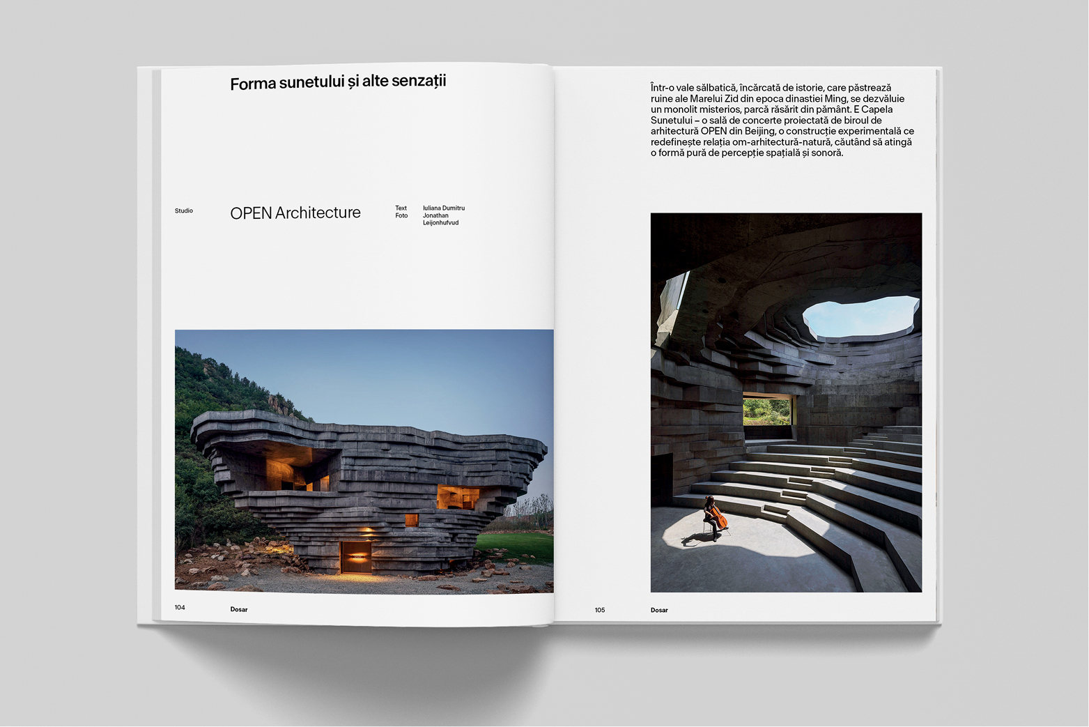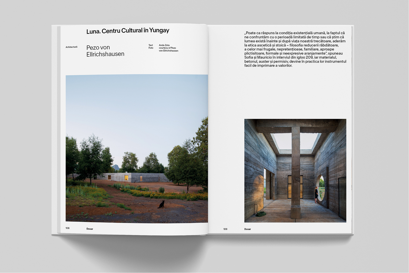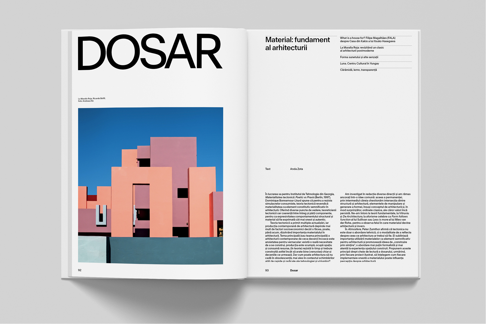 De la revizitarea unui clasic al arhitecturii postmoderne, Ricardo Bofill și structurile sale labirintice concepute pentru Muralla Roja – un impresionant complex de locuințe în Alicante, Spania, realizat în 1973 –, la arhitectura ca formă pură de percepție spațială și sonoră concretizată în Capela Sunetului, o sală de concerte realizată de biroul de arhitectură OPEN Architecture din Beijing, într-o vale sălbatică ce păstrează încă urme ale ruinelor Marelui Zid din epoca dinastiei Ming, oprindu-ne la structura ritmată a Lunei, Centrul Cultural din Yungay creat de Pezo von Ellrichshausen am conturat un Dosar care nu se oprește doar la schițarea substratului material al arhitecturii, cât, mai ales, explorează importanța și necesitatea utilizării materialelor ca element semnificativ, promovând ideea de „construire prin simțire”, o abordare mai puțin formalistă și mai atentă la experiența spațiului construit.