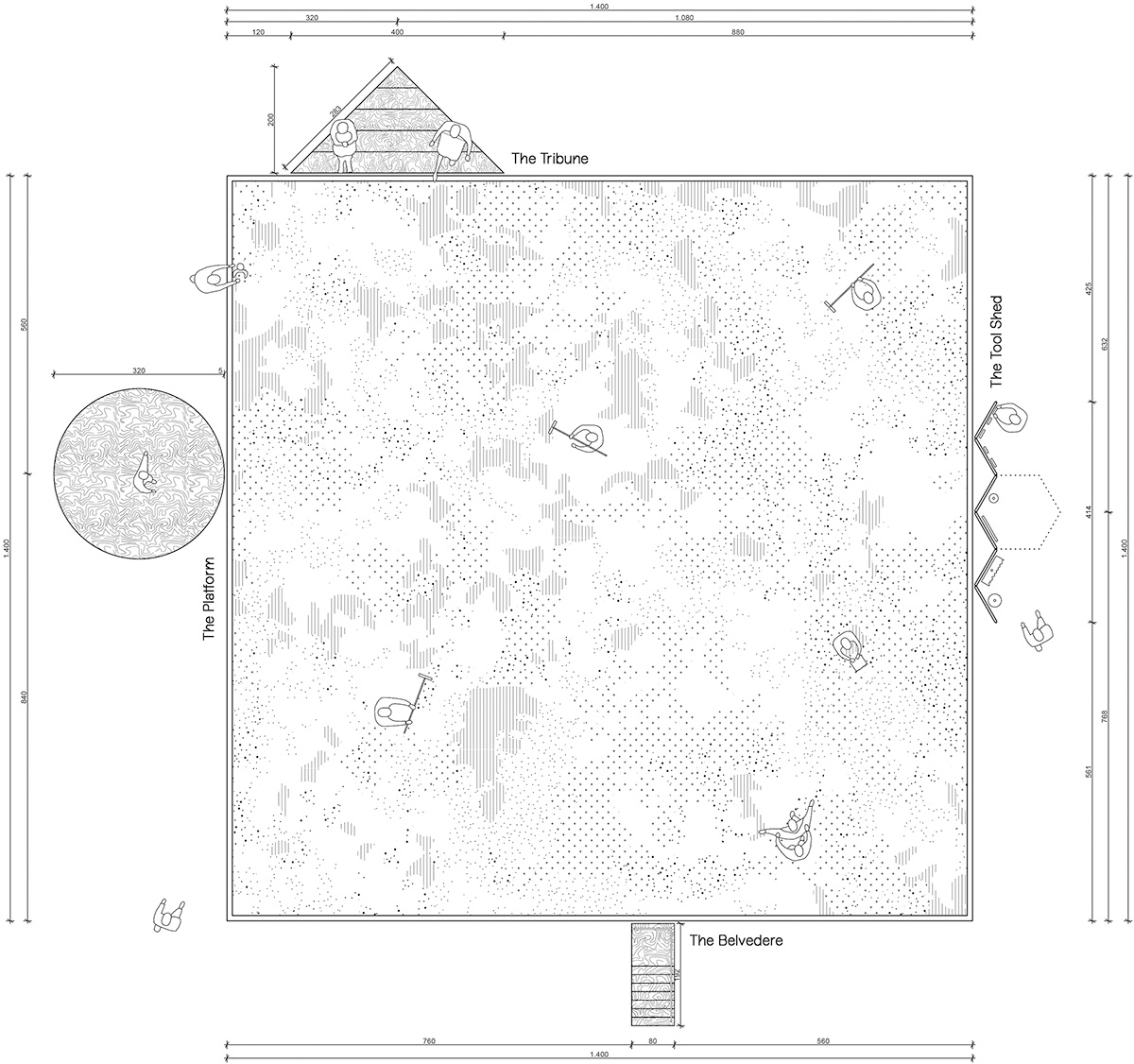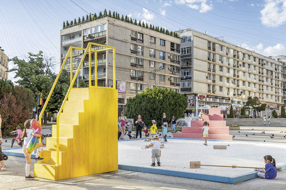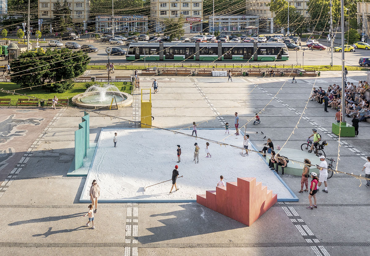 O tăbliță de desen la scară umană, un teatru public cu scenă deschisă – pavilionul poetic realizat de Studio Ossidiana în cadrul primei ediții a bienalei de arhitectură Common Imaginary din cadrul Romanian Creative Week a propus o schimbare de paradigmă a utilizării spațiului public, transformând Piața Unirii într-un spațiu ludic.