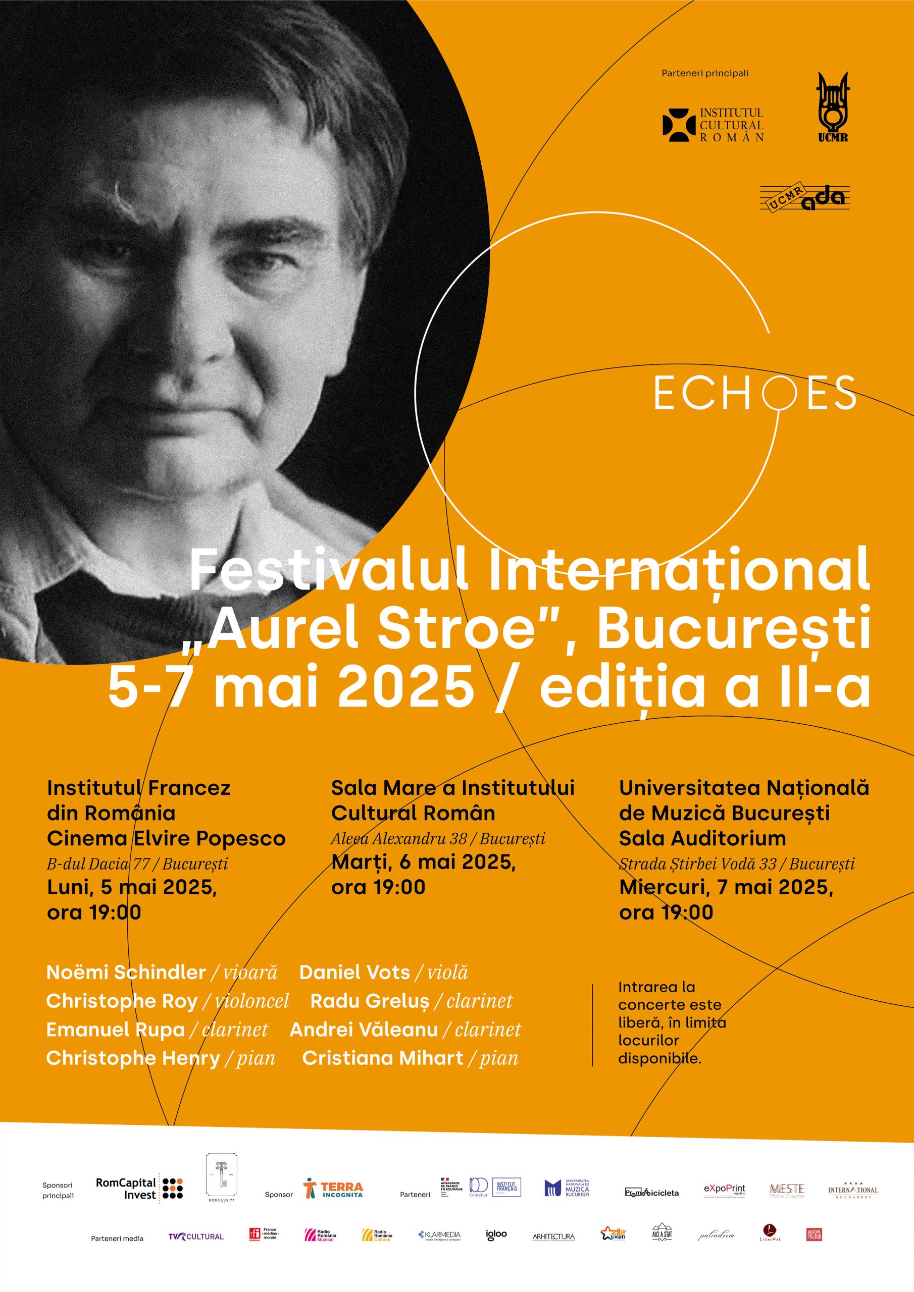 (Bernard Cavanna) ECHOES – Festivalul Internațional „Aurel Stroe” va avea loc în perioada 5-7 mai 2025, în București, fiind inițiat de Maria-Clara Brumariu, nepoata compozitorului. În cea de-a doua ediție sunt programate trei concerte: la Institutul Francez din România, Institutul Cultural Român și Universitatea Națională de Muzică din București. Concertul de la Institutul Francez din România, la Cinema Elvire Popesco, va include proiecția filmului documentar „Aurel Stroe”, realizat în anul 2002 de Bernard Cavanna și Laurence Pietrzak. Accesul la concerte este liber, în limita locurilor disponibile.