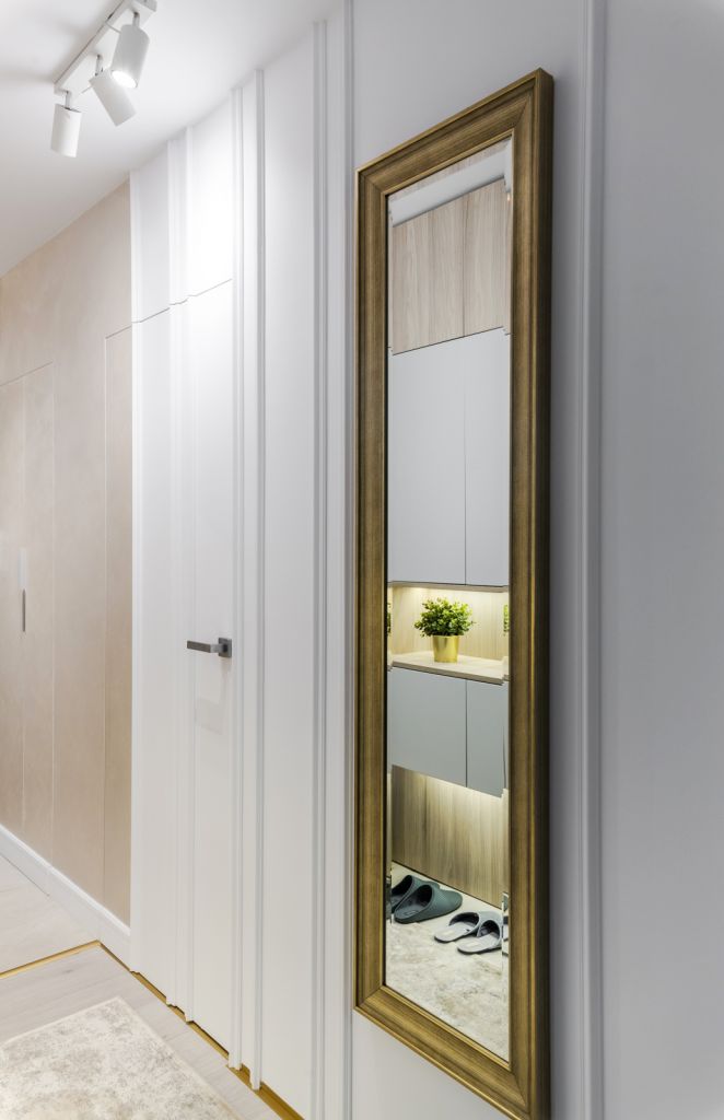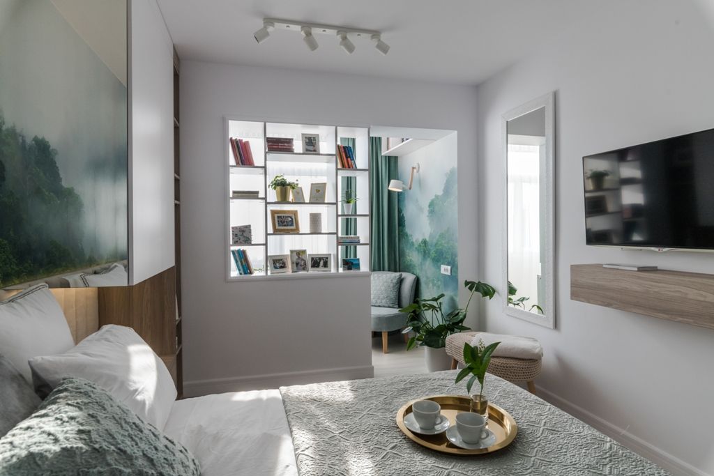 În ciuda constrângerilor spaţiale, în apartament şi-au găsit locul o serie de elemente de depozitare generoase ce corespund necesităţilor, fără a sufoca vizual încăperile. Acestea au fost realizate pe comandă şi montate suspendat, pentru a lăsa pardoseala cât mai liberă şi accesibilă. Detalii precum oglinzile, finisajele în tonuri deschise, fototapetul 3D sau vopseaua albă folosită în camerele în care iluminarea naturală era deficitară, creează impresia de spaţiu mai amplu.