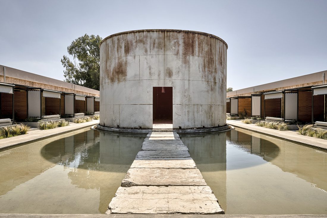 În jurul celor doi coloși din beton și oțel care domină liniștita curte interioară s-a construit o piscină de mică adâncime, ce captează lumina și răcorește aerul. Lespezile masive ce servesc drept trepte în piscină sau blaturi de mese, în pavilionul de relaxare, sunt chiar blocuri decupate din rezervoarele inițiale pentru a crea deschideri. La capetele laturilor cu camere înșiruite au fost adăugate două pavilioane gândite ca spații comune, deschise, destinate recepției, restaurantului, barului, dar și activităților cultural-artistice – inclusiv gastronomice – ce fac parte din programul „curatorial” estival al acestui boutique hotel atipic.