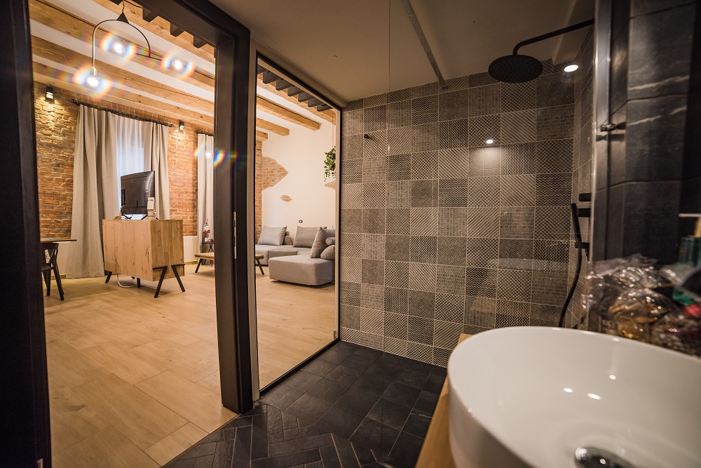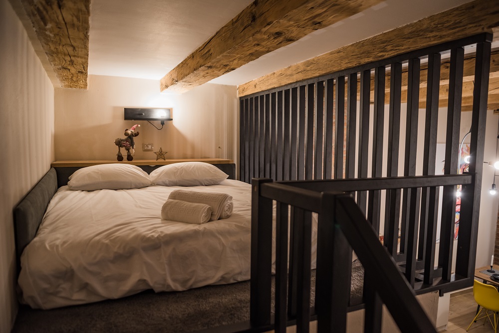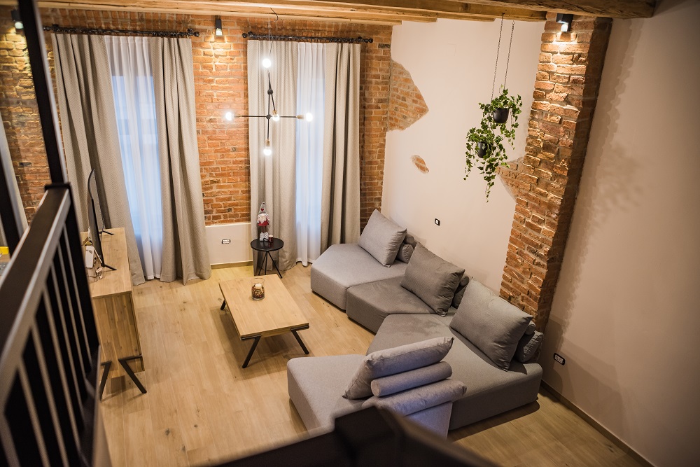 Vom face o plimbare virtuală prin „The Loft”, unul dintre cele patru spații amintite, unde înălțimea generoasă (aproape 4 metri) a permis amplasarea dormitorului deasupra băii. Într-un decor susținut de cărămida lăsată aparentă pe alocuri și de „grinzile originale ale planșeului, recondiționate și scoase în evidență prin vopsirea în alb a zonelor rămase libere între ele”, mobilierul și textilele și-au găsit loc în nuanțe naturale și neutre completate de culoare în obiectele decorative și de negrul corpurilor de iluminat și bateriilor din baie.