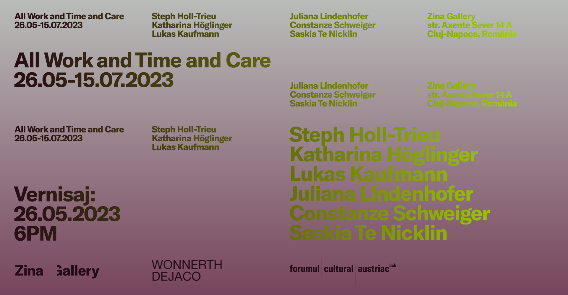 Zina Gallery anunță expoziția de grup intitulată All Work and Time and Care, cu artiștii și artistele Steph Holl-Trieu, Katharina Höglinger, Lukas Kaufmann, Juliana Lindenhofer, Constanze Schweiger și Saskia Te Nicklin. Vor fi prezentate lucrări recente și noi ale acestora, în medii ce variază de la instalație, desen, pictură, la sunet și video.