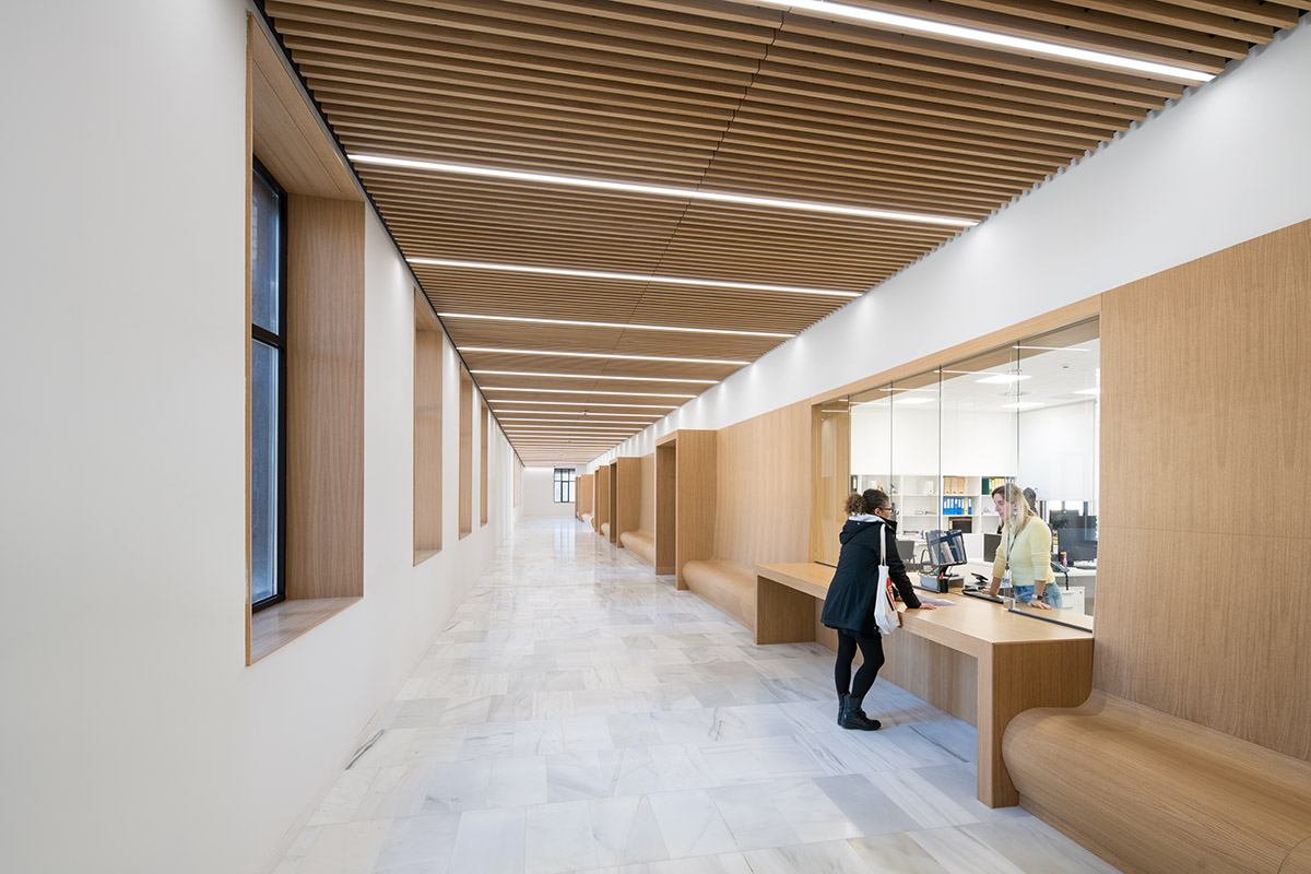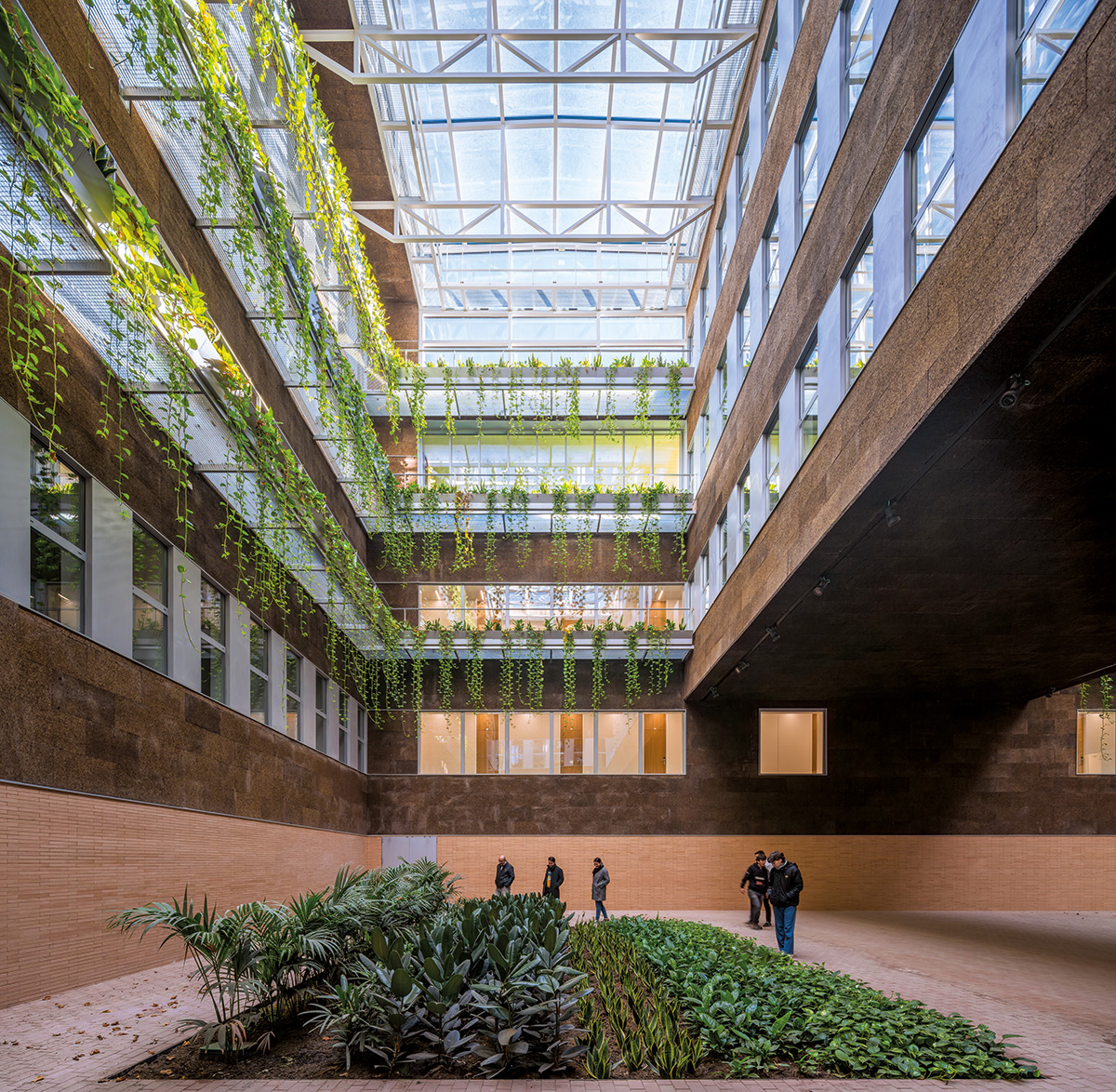 La interior, proiectul rămâne consecvent, creând o distribuție clară și rațională, cu spații de lucru comune, generoase și confortabile, variate și extrem de luminoase. Un fel de agora acoperită servește ca loc multifuncțional, de întâlnire, de socializare, de studiu sau de relaxare.