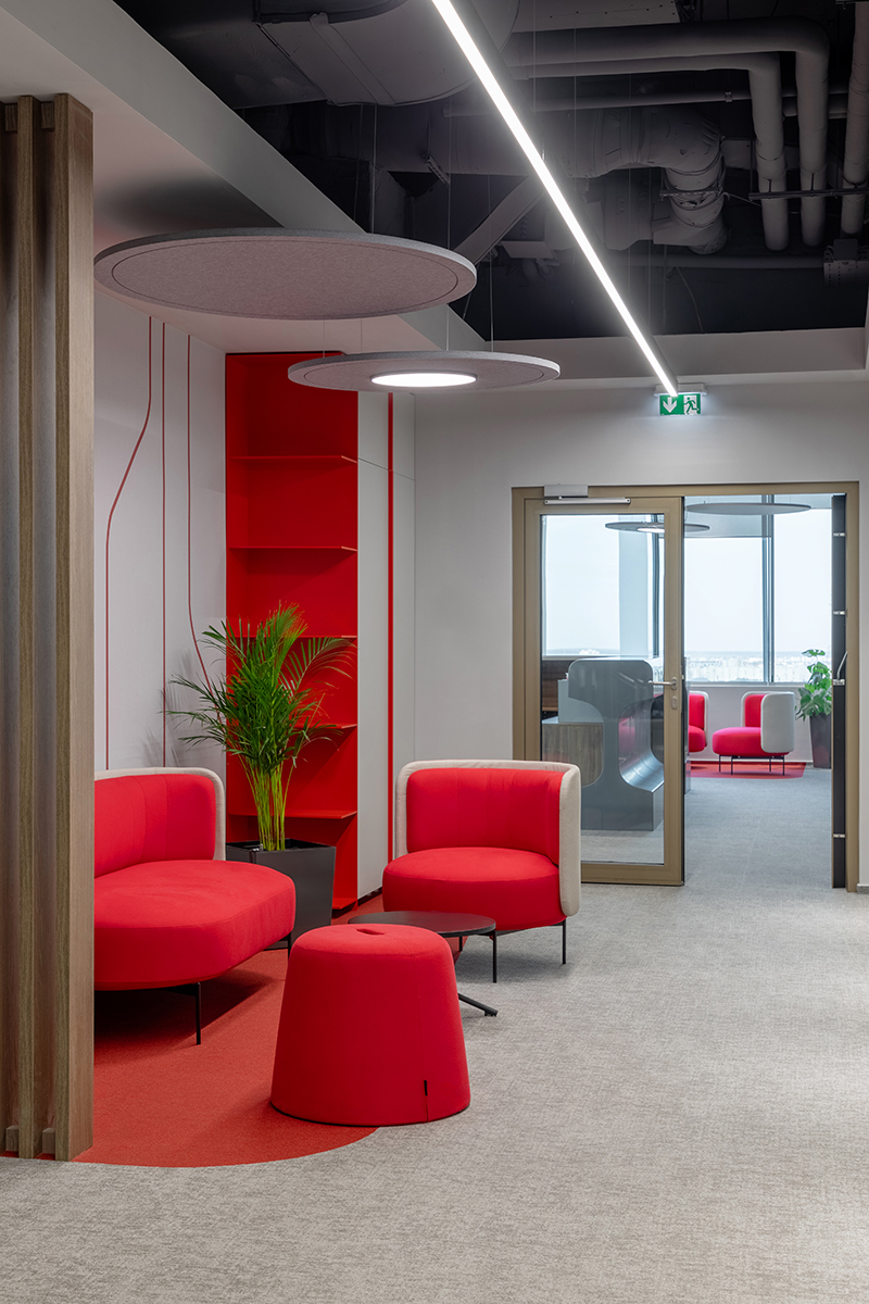 Designul interior valorifică simboluri definitorii pentru companie. Recepția, amplasată strategic în zona liftului panoramic, constituie atât un spațiu de întâlnire, cât și unul de reprezentare, prin pupitrul cu formă de șină de cale ferată – o trimitere la domeniul de activitate al companiei. Tot aici, o masă de meeting și o zonă de relaxare creează cadrul ideal pentru dialog și socializare. Din acest punct, un traseu circular conduce vizitatorii și angajații către celelalte spații, accentuând ideea de continuitate și coerență în experiența utilizatorului.