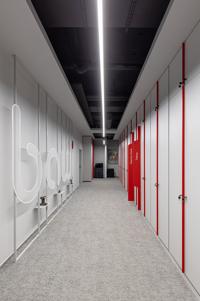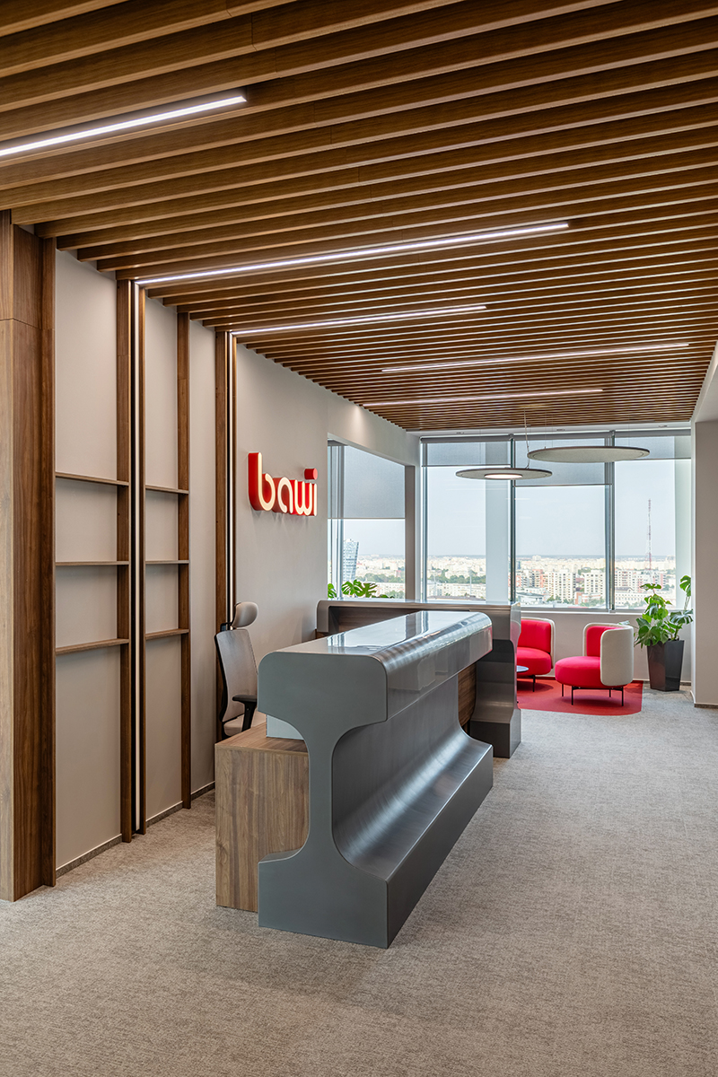 Proiectul de amenajare a birourilor BAWI Construction, furnizor de servicii complete pentru infrastructura feroviară, pune accent pe fluiditatea circulației și pe integrarea zonelor de lucru cu cele destinate interacțiunii, atingând un echilibru optim între funcționalitate și confort. Elementele ce țin de identitatea vizuală a companiei și detalii precum plafoanele riflate susțin o atmosferă dinamică, încurajând productivitatea și descoperirea.
